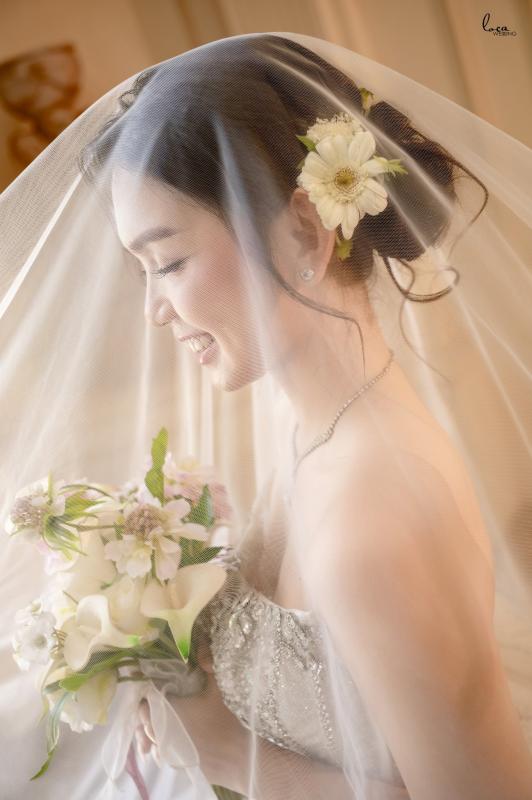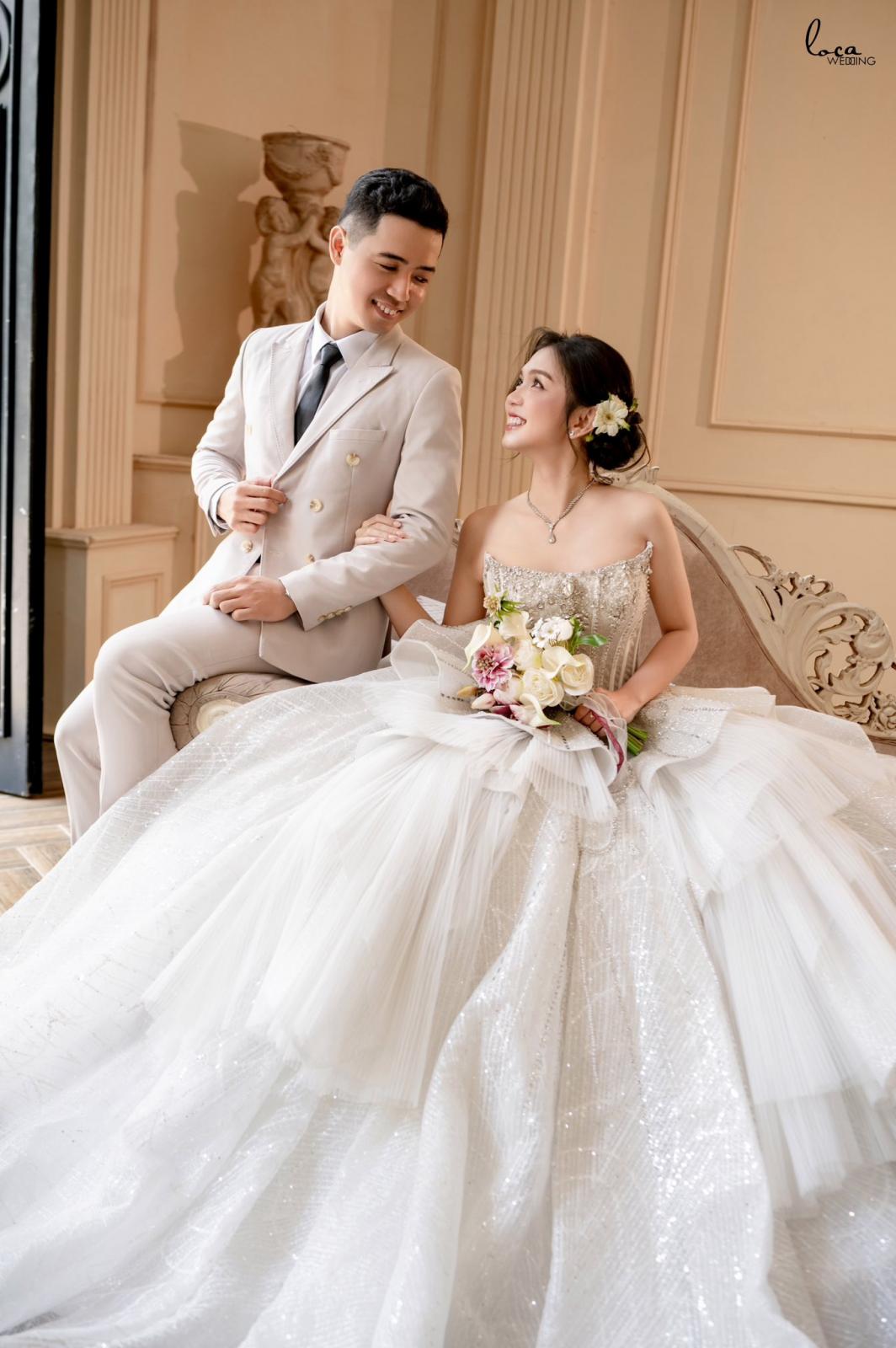 Phom dáng cổ điển được điều chỉnh khéo léo để tôn dáng, cùng với voan cưới cùng tông, mang đến tổng thể thanh thoát nhưng vẫn đầy khí chất.