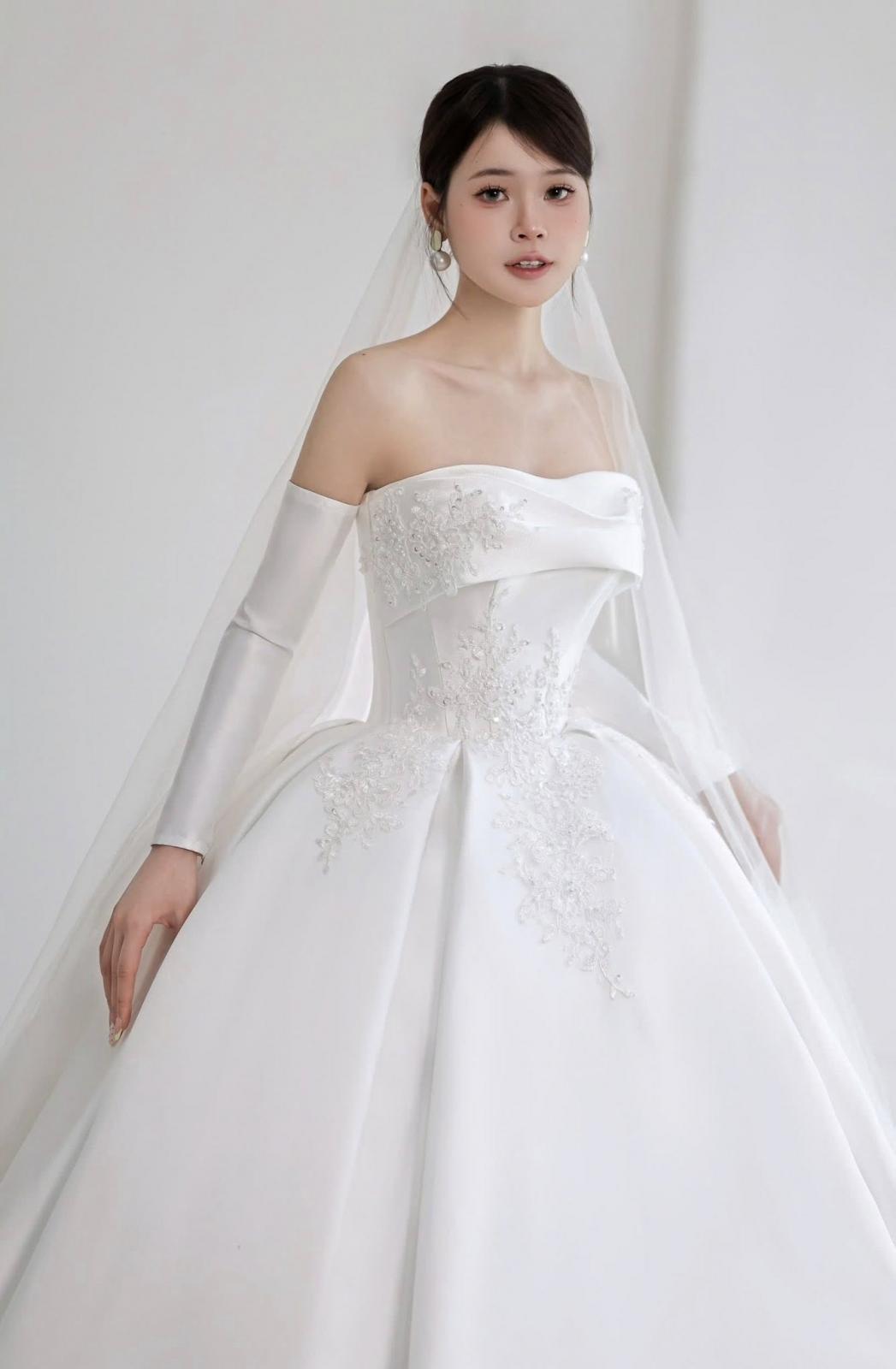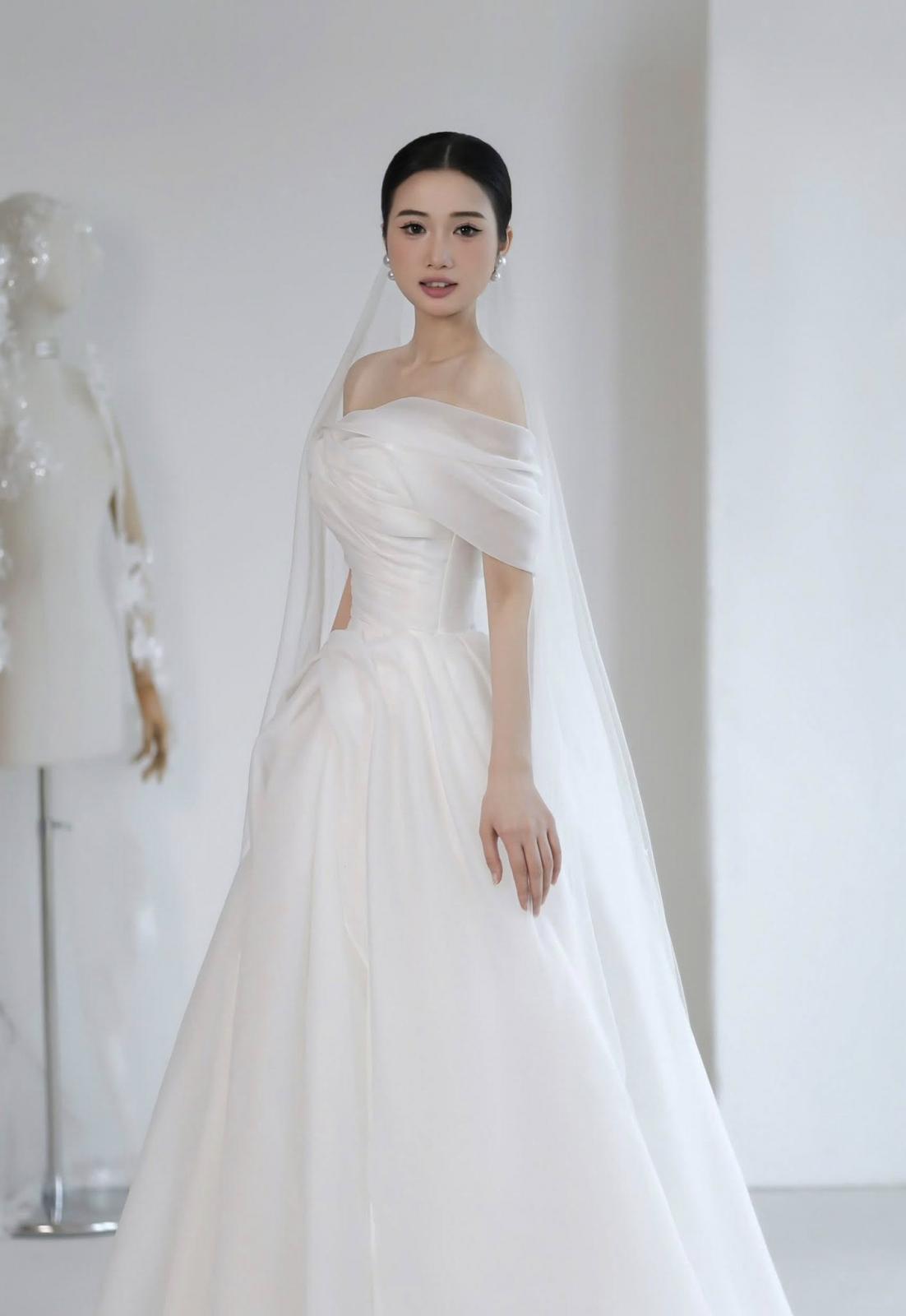 Floral Whisper mang đến vẻ đẹp thanh thoát và đầy nữ tính với phom dáng chữ A xòe nhẹ nhàng. Thiết kế trễ vai tôn lên nét mềm mại, tạo nên sự quyến rũ tinh tế mà bất kỳ nàng dâu nào cũng yêu thích. Đây là lựa chọn hoàn hảo cho nàng dâu chụp pre-wedding hoặc làm trang phục đi bàn sau lễ chính, đảm bảo nàng sẽ luôn toả sáng trong mọi khoảnh khắc.