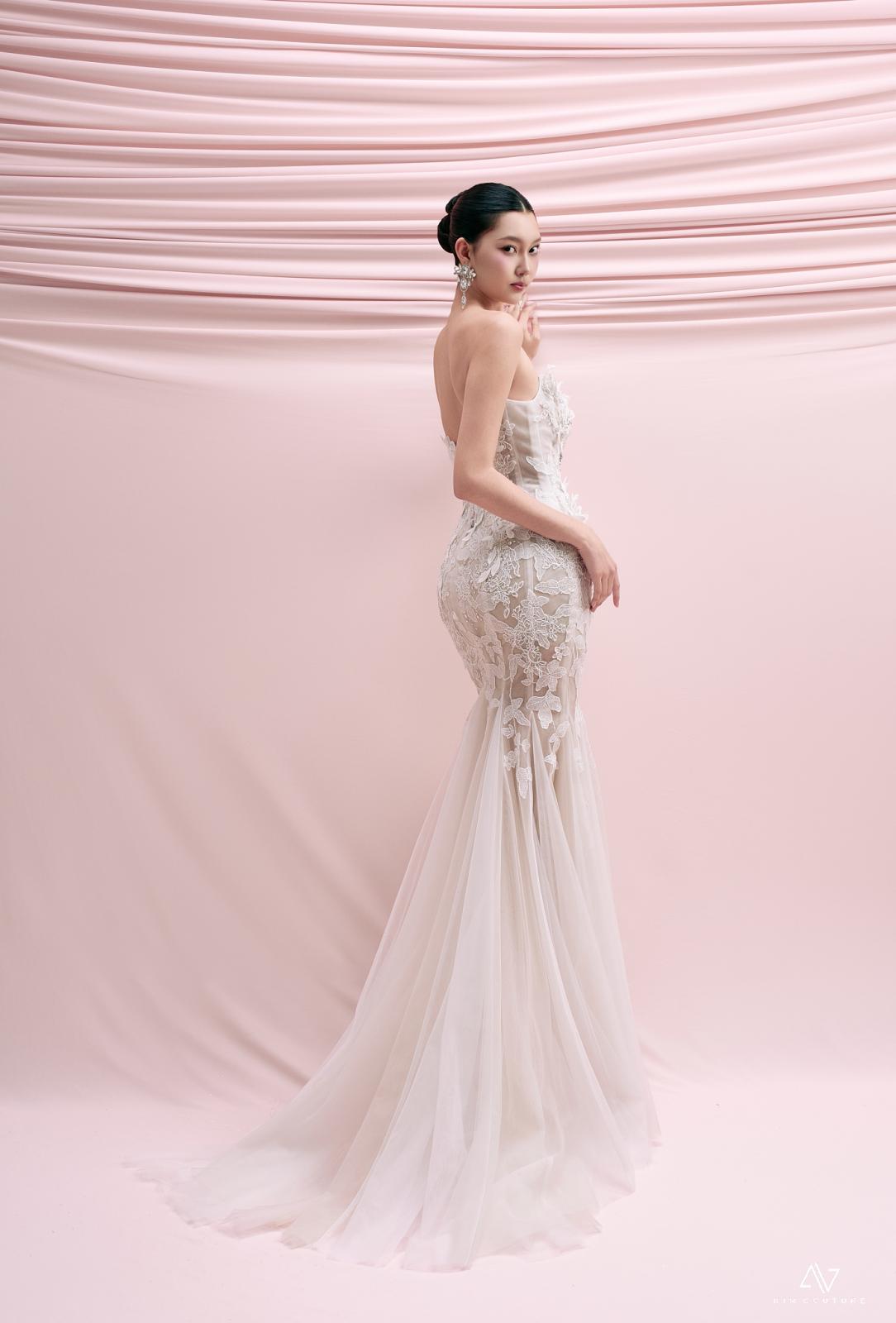 Phom dáng mermaid ôm sát tôn trọn đường cong cô dâu, đi cùng nền vải nude tạo hiệu ứng second-skin đầy tinh tế, để mỗi chuyển động đều trở nên mong manh và dịu dàng. Điểm nhấn nằm ở kỹ thuật đính kết hoa 3D nổi phủ dọc thân váy, với từng cánh hoa được tạo hình thủ công, xen lẫn ren thêu và pha lê swarovski nhuyễn để vẫn có được sự bắt sáng nhẹ nhàng mà nổi bật ở mỗi góc ảnh. Kết hợp phần ngực cúp tim mềm mại kết hợp tay sheer dài trong suốt, tạo cảm giác thanh thoát và kiêu kỳ - và mọi chi tiết đã tạo nên một thiết kế mang đầy tính thẩm mỹ để khẳng định vị thế, tính cách cùng thần thái của cô dâu.