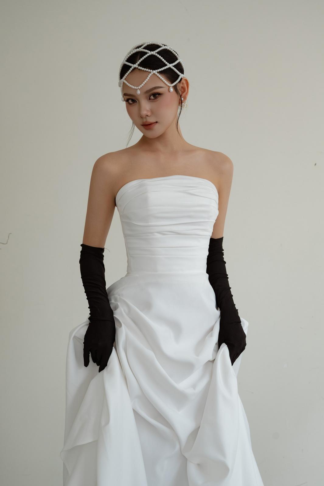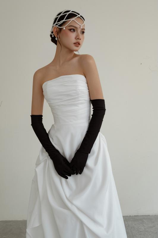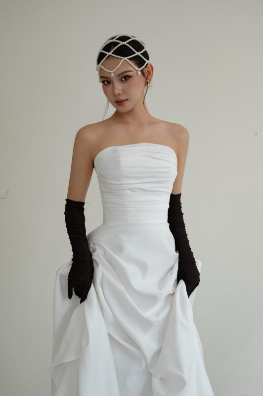 Thiết cúp ngực tối giản, ôm gọn phần thân trên giúp tôn dáng cực kỳ tinh tế. Phần chân váy xếp nếp mềm mại tạo độ bồng vừa đủ, nhìn sang mà không hề rườm rà.