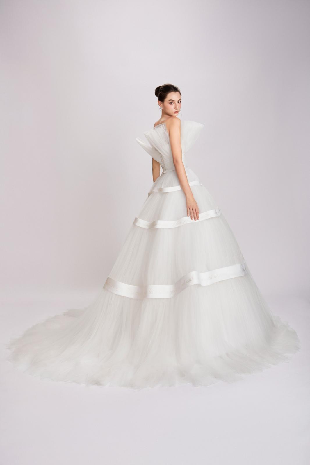 Bên cạnh các chi tiết cầu kỳ, phom dáng tổng thể vẫn giữ được nét kinh điển của dòng váy cưới công chúa. Tùng váy dáng A-line xòe rộng với nhiều lớp tuyn (tulle) chồng lên nhau tạo độ phồng tự nhiên mà không hề gây cảm giác nặng nề.