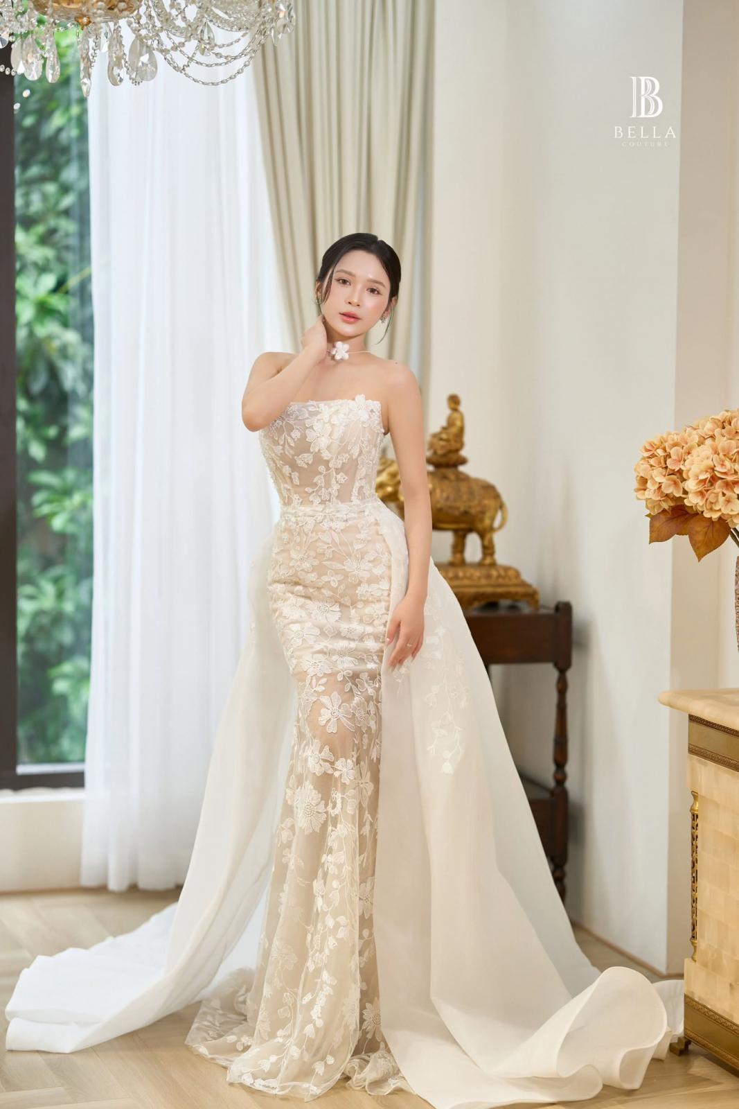 Bên dưới, phần tùng váy phi phủ ren bồng bềnh bằng chất liệu satin cao cấp mang đến độ phồng vừa phải, giữ lại tinh thần tinh khiết.
