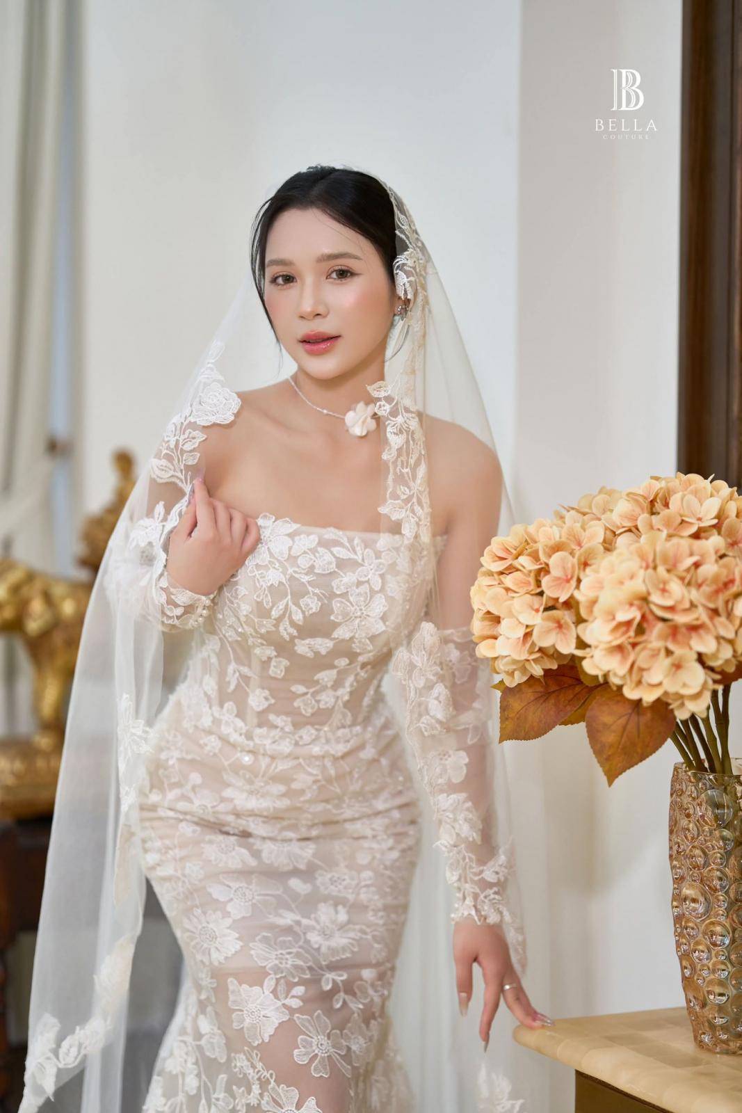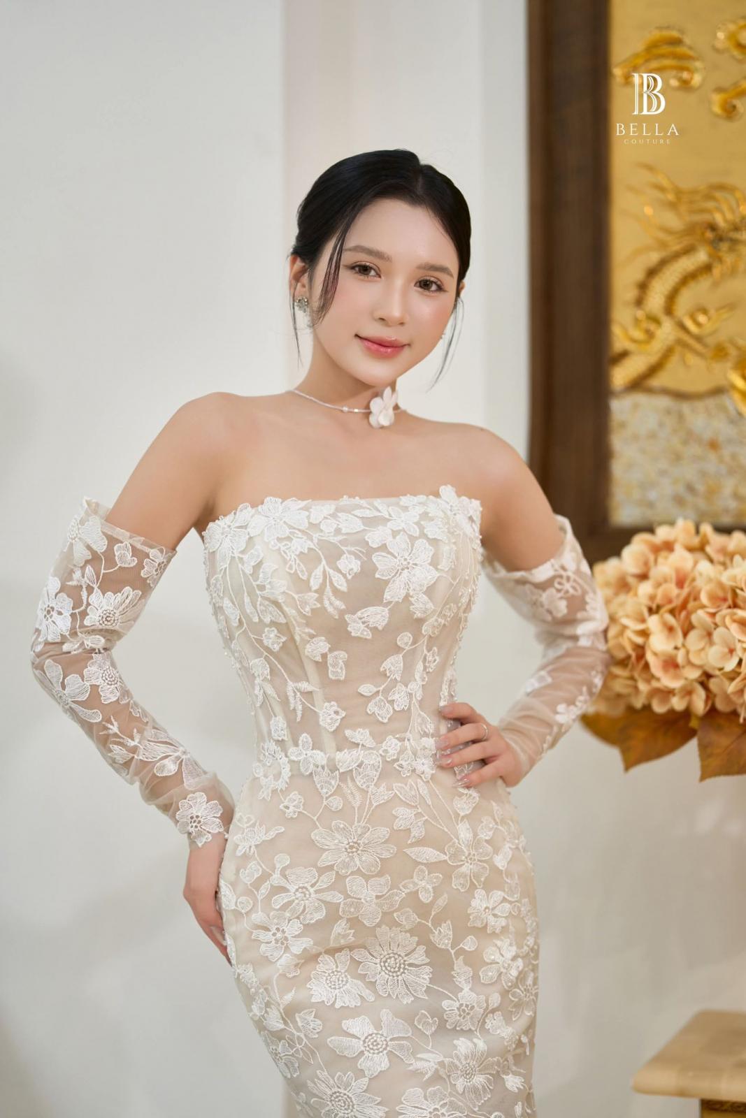 Trên nền ren thủ công mềm mại ôm lấy phần thân trên, từng họa tiết ren tỉ mỉ được đính kết như những nốt nhạc, tôn lên nét thanh tao và nữ tính tuyệt đối của cô dâu.
