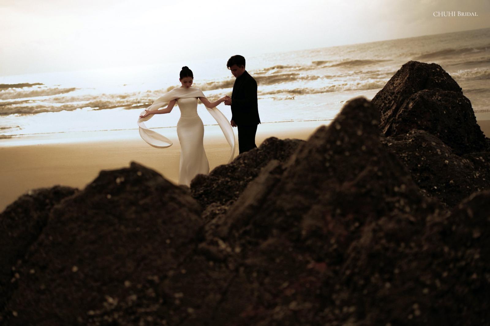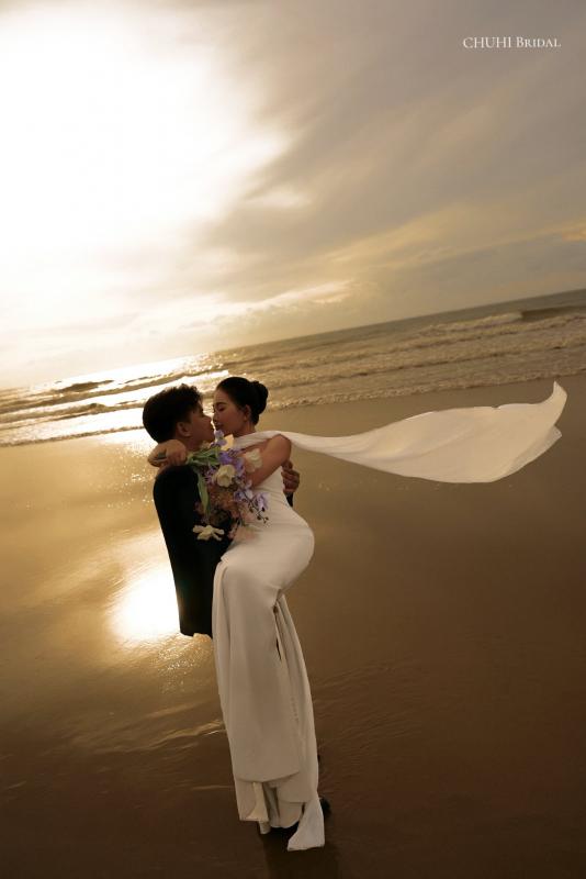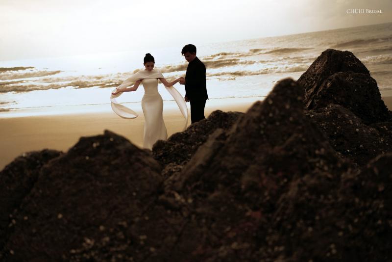 The design of this ballgown starts with a clearly defined vertical-boned corset, providing a structured fit and a classic cinched waist. Botanical-patterned lace is layered over a sheer mesh base to create a detailed, textured look on the bodice. To add a soft glow, the lace is decorated with small pearls and clear sequins that reflect light naturally as the bride moves.
