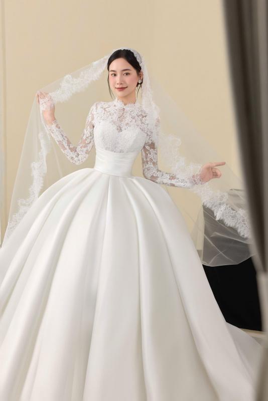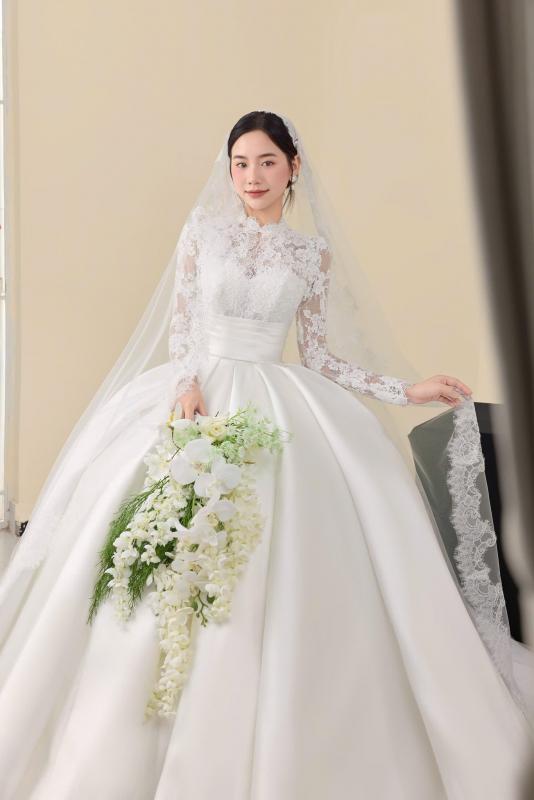 Thiết kế khai thác trọn vẹn ngôn ngữ của đường cắt bất đối xứng và cấu trúc tạo khối với tùng váy hai tầng được xử lý tương phản. Đặc biệt, chi tiết tùng phủ có thể tháo rời cho phép cô dâu biến hóa diện mạo từ một silhouette ball gown lộng lẫy sang dáng A-line thanh thoát chỉ trong tích tắc.