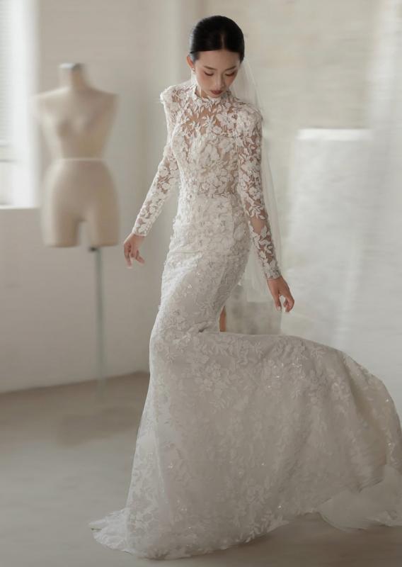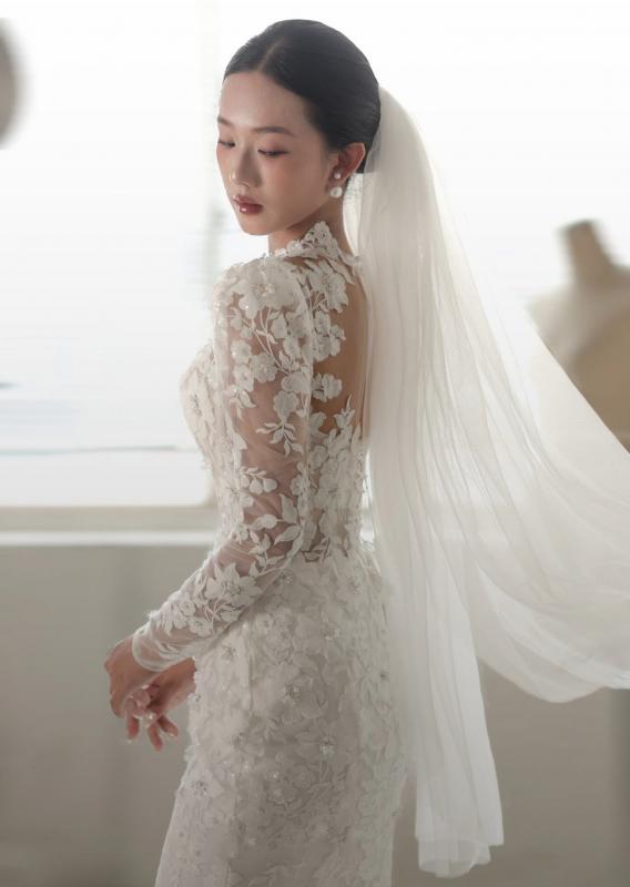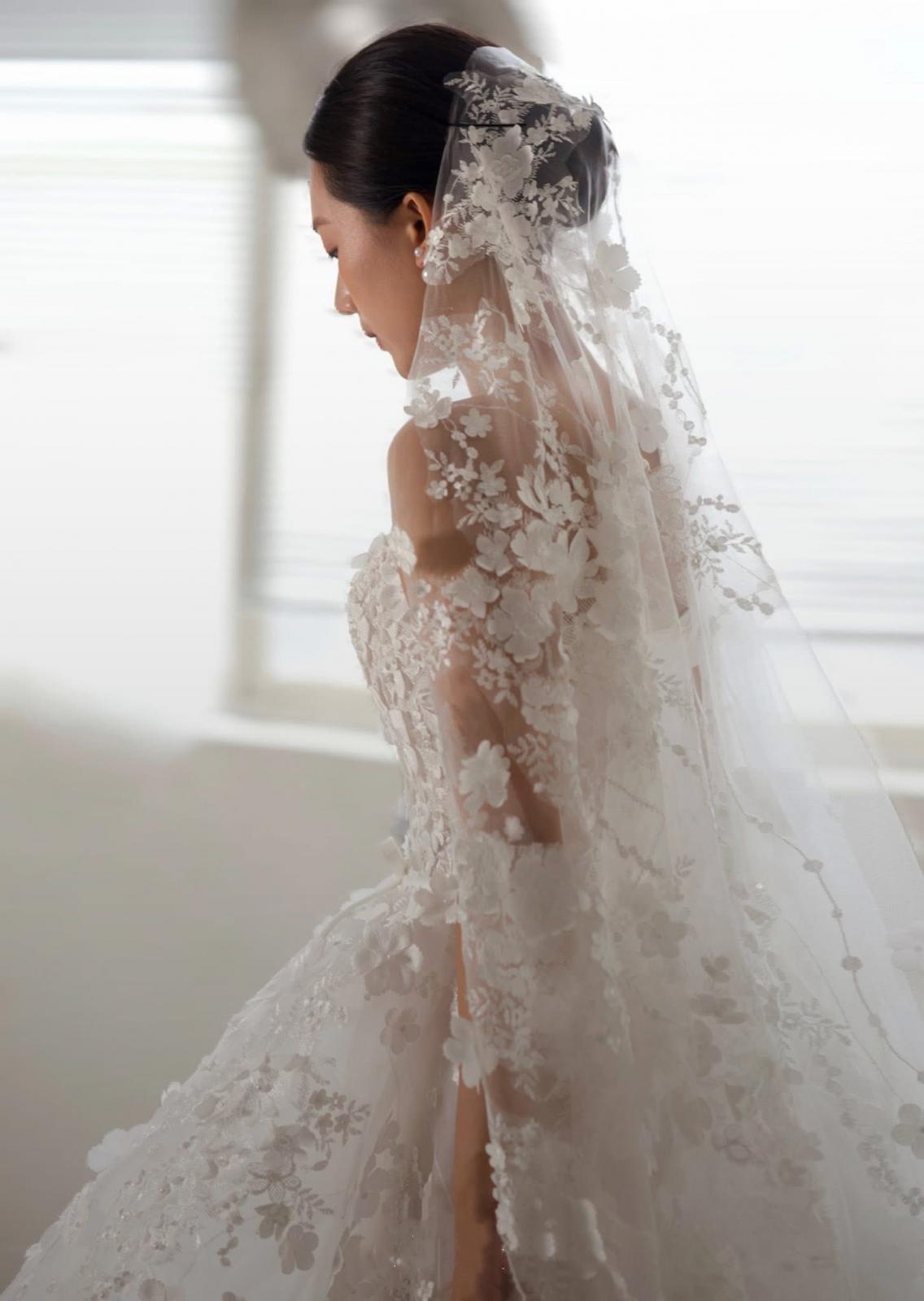 Không phải ngẫu nhiên mà mẫu váy này được gọi là “trái tim” của Love Story . Đó là kết quả của hơn 720 giờ tỉ mỉ, nơi từng bông hoa nhỏ bé được cắt uốn và đính kết bằng tay, tựa như từng nhịp thở yêu thương được gửi gắm vào từng sợi vải.