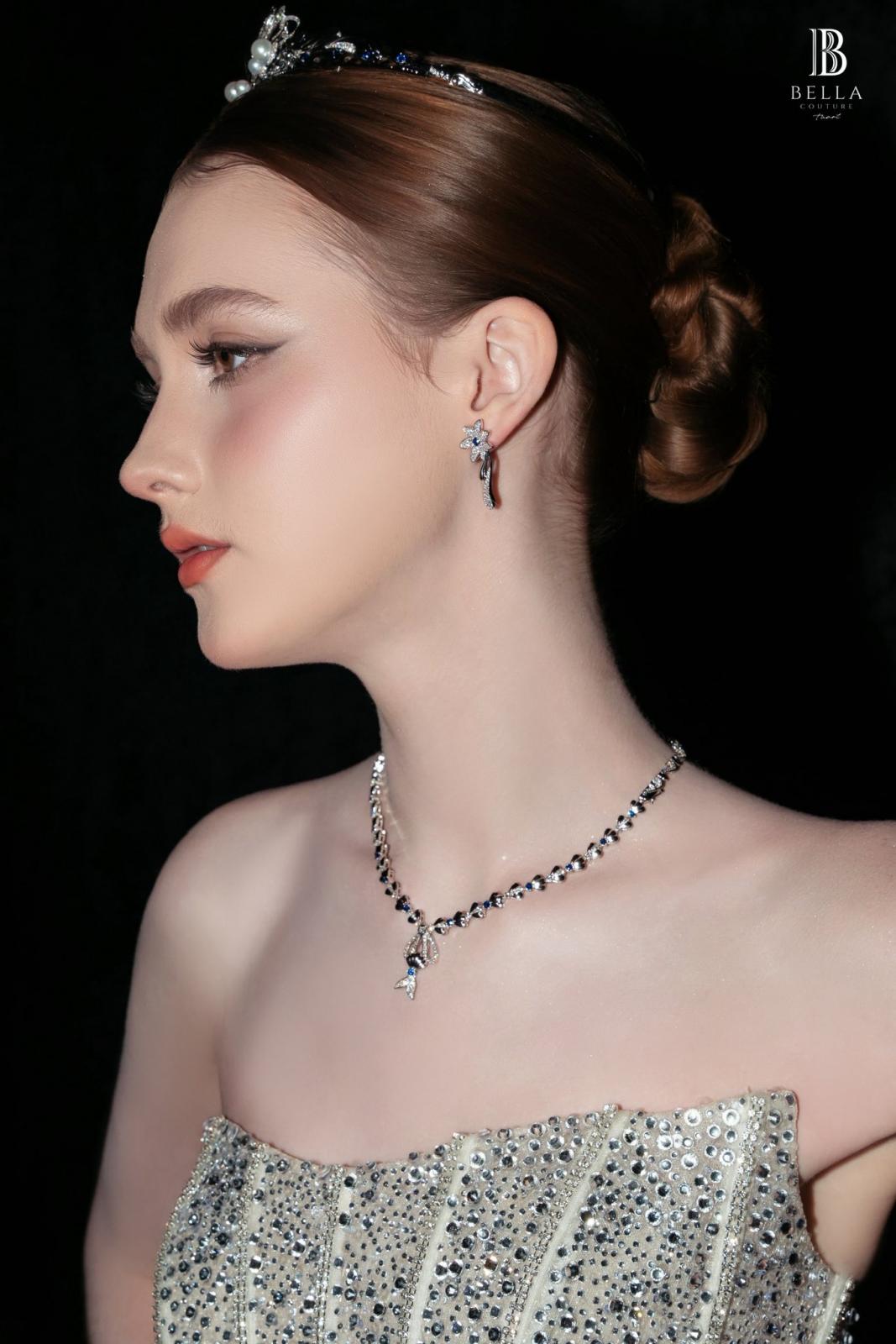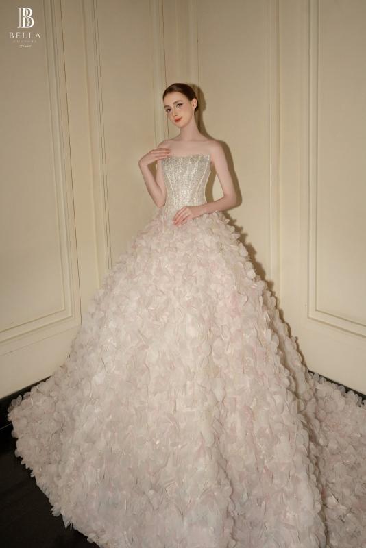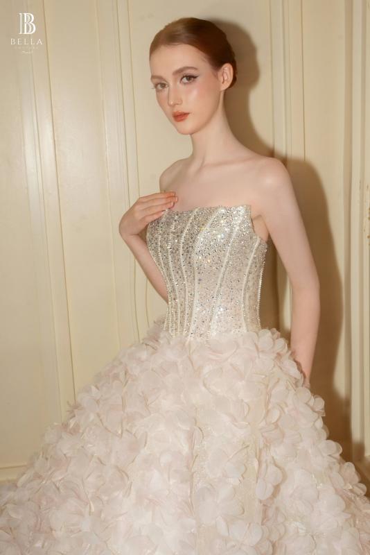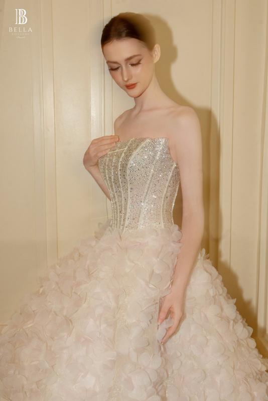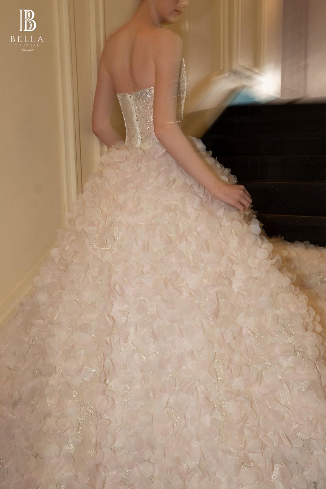 La Rose – một sự giao hòa giữa quyền lực và mong manh. Corset độc bản ôm lấy cơ thể, khắc họa vóc dáng thanh thoát, để mỗi bước chân cô dâu trở thành một bản giao hưởng của sự kiêu hãnh và dịu dàng.