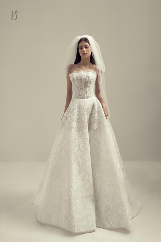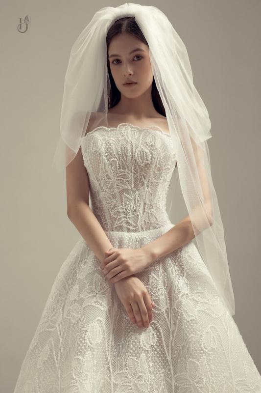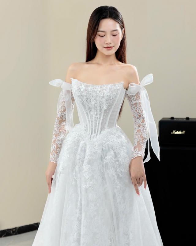 Thiết kế váy cưới dáng suông A line, sử dụng chất liệu ren cao cấp kết hợp cùng form dáng corset ôm nhẹ phần thân trên, giúp tôn trọn vòng eo thon gọn và đường nét nữ tính của cô dâu. Phần ngực tạo dáng cúp tim mềm mại, xử lý tinh tế để vừa quyến rũ vừa giữ được sự thanh lịch cần có trong ngày trọng đại.