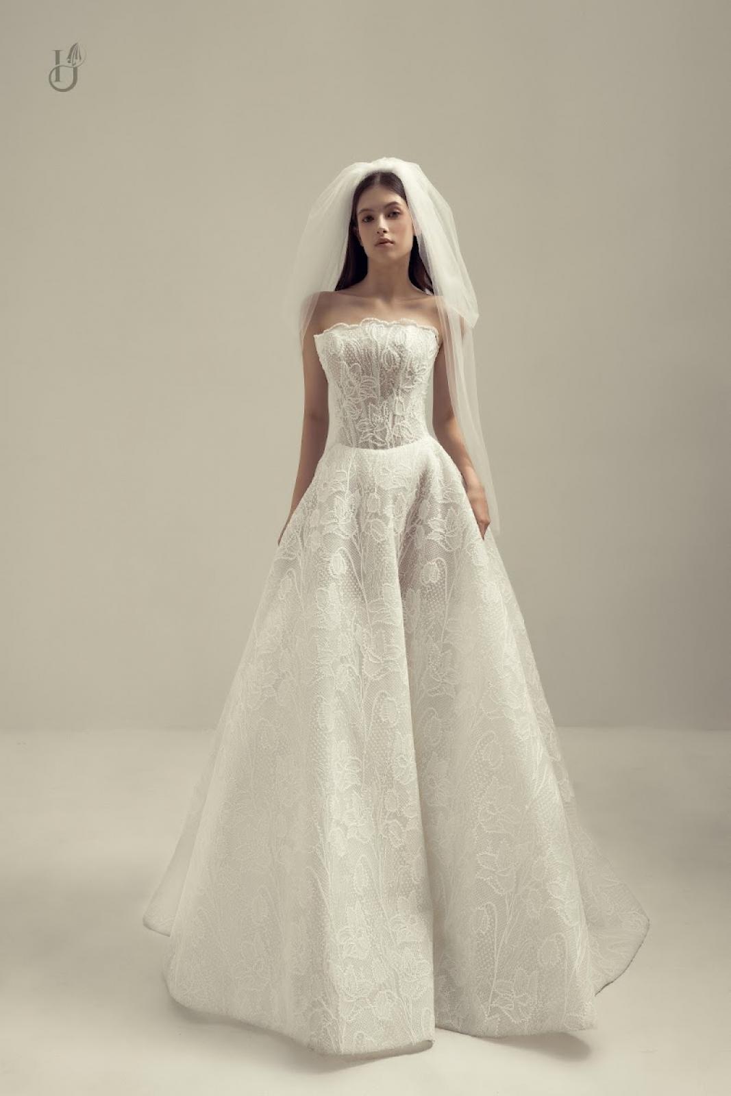Thiết kế váy cưới dáng suông A line, sử dụng chất liệu ren cao cấp kết hợp cùng form dáng corset ôm nhẹ phần thân trên, giúp tôn trọn vòng eo thon gọn và đường nét nữ tính của cô dâu. Phần ngực tạo dáng cúp tim mềm mại,1