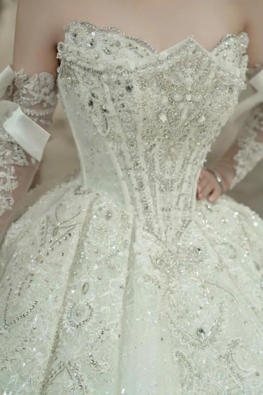 Như lời tuyên ngôn riêng về phẩm chất và cả tính của một nữ hoàng HongKong đem đến thiết kế ball-gown với dáng xoè rộng cùng những đường xếp ly tinh tế và lấp lánh khéo léo tôn lên hình ảnh cô dâu thật lộng lẫy trong ngày trọng đại.