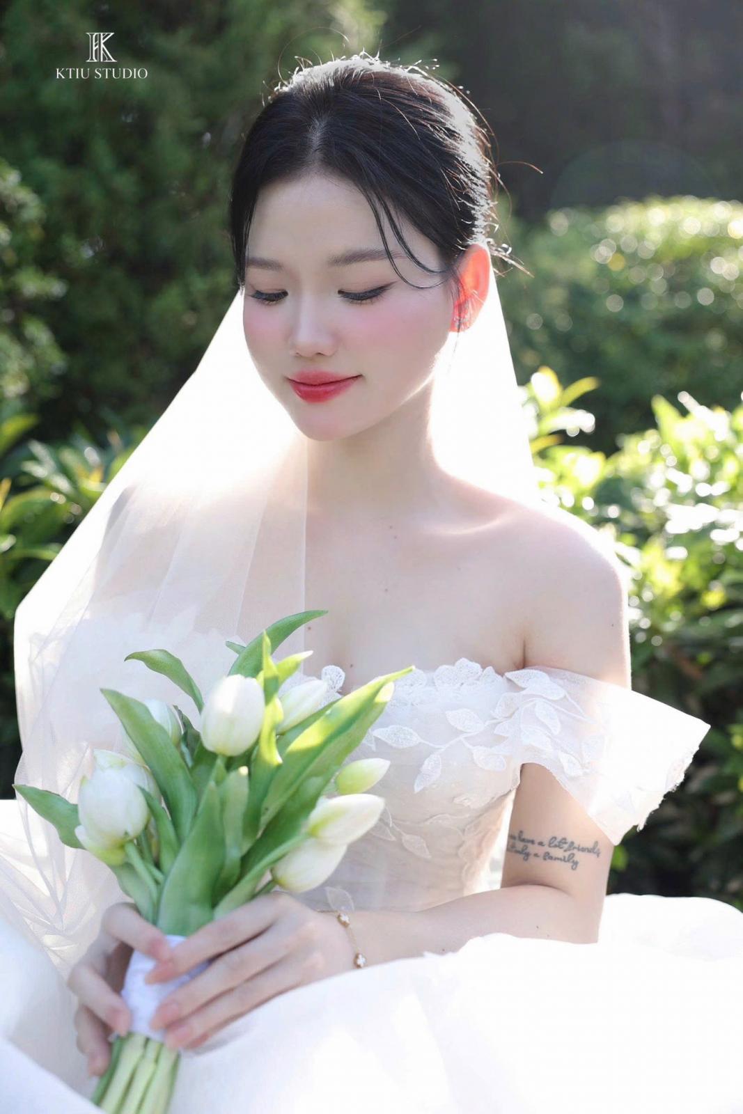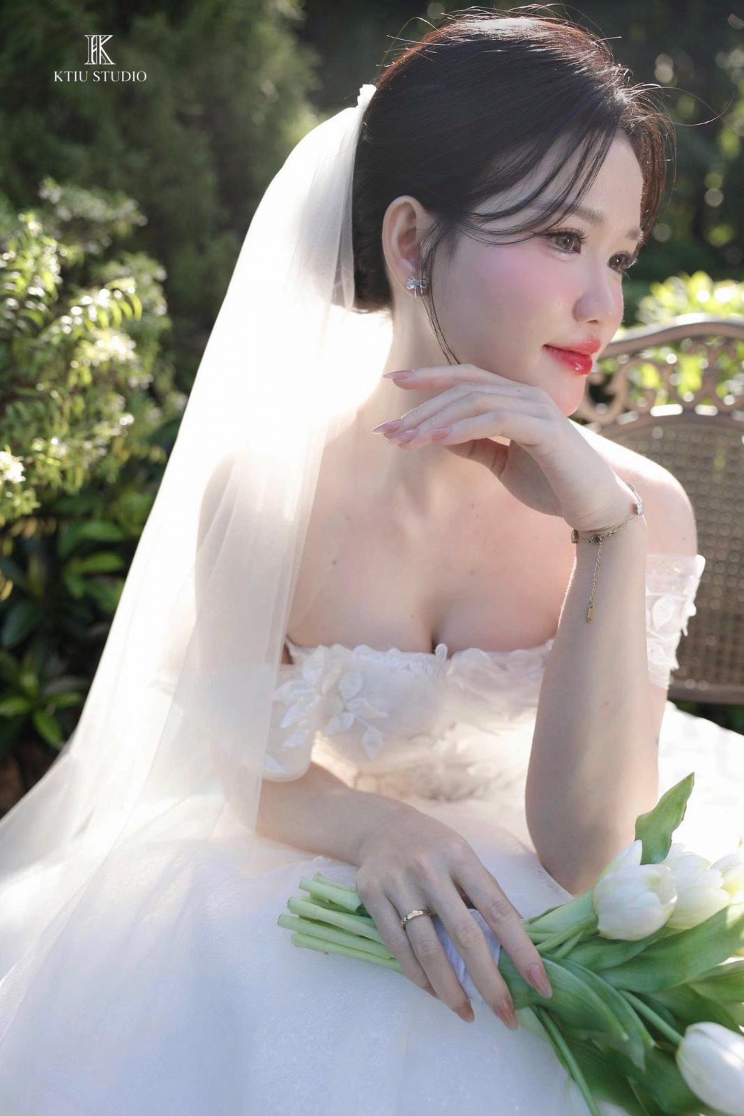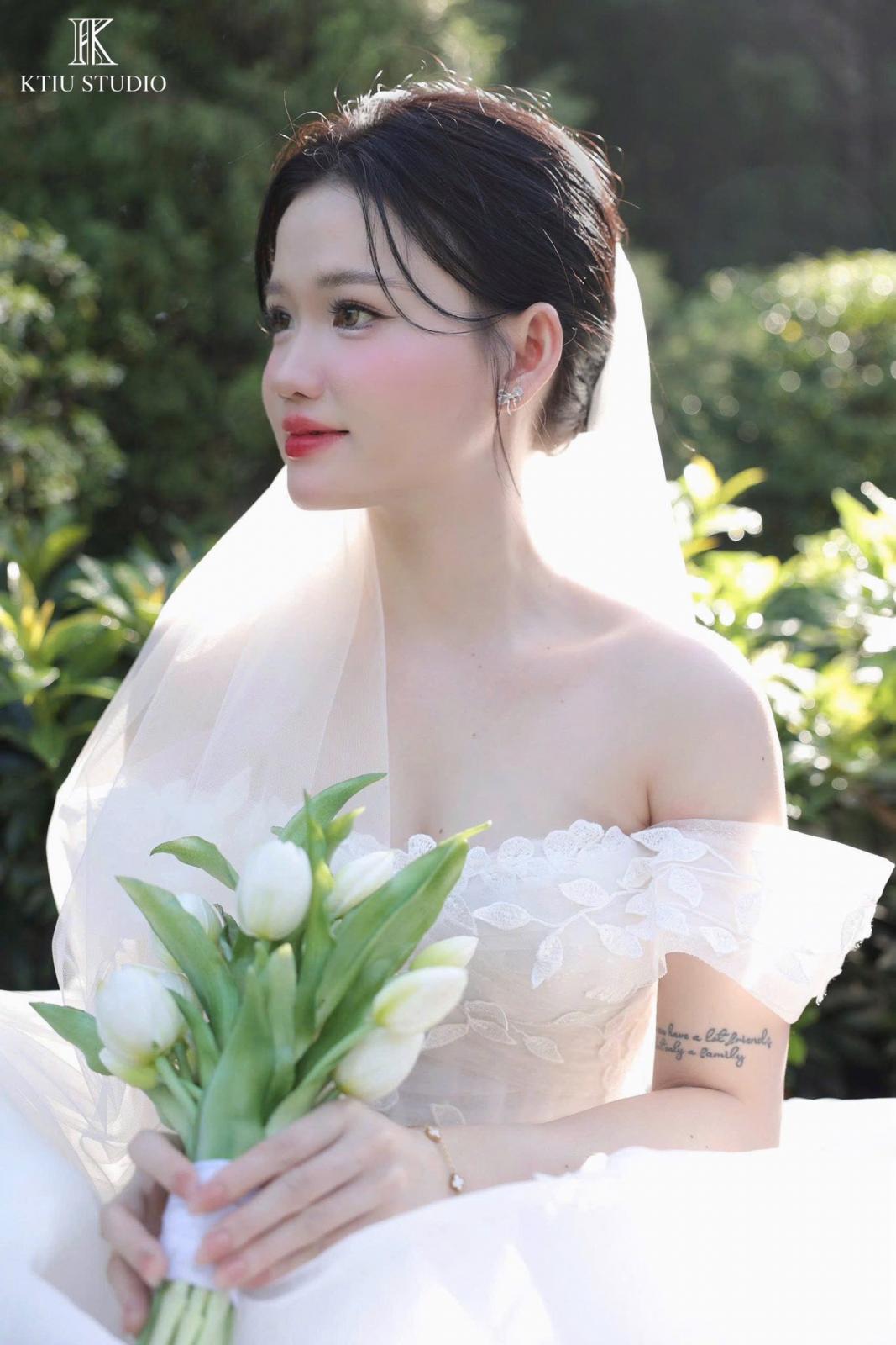 Bó tulip trắng nhẹ nhàng trên tay, làn da sáng mịn dưới ánh nắng, chiếc váy trễ vai đính ren tinh xảo… tất cả tạo nên hình ảnh một cô dâu vừa ngọt ngào, vừa thanh lịch, vừa đủ để khiến ai nhìn cũng thấy bình yên.