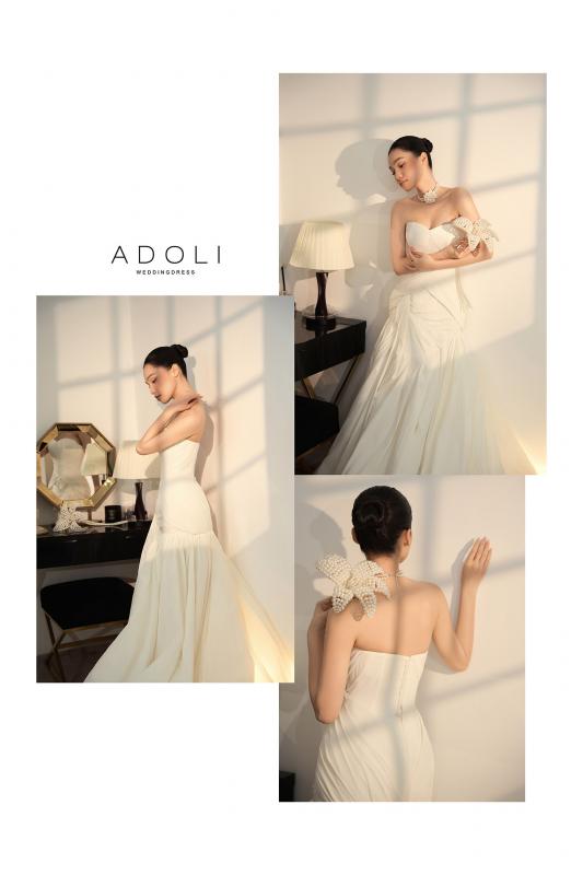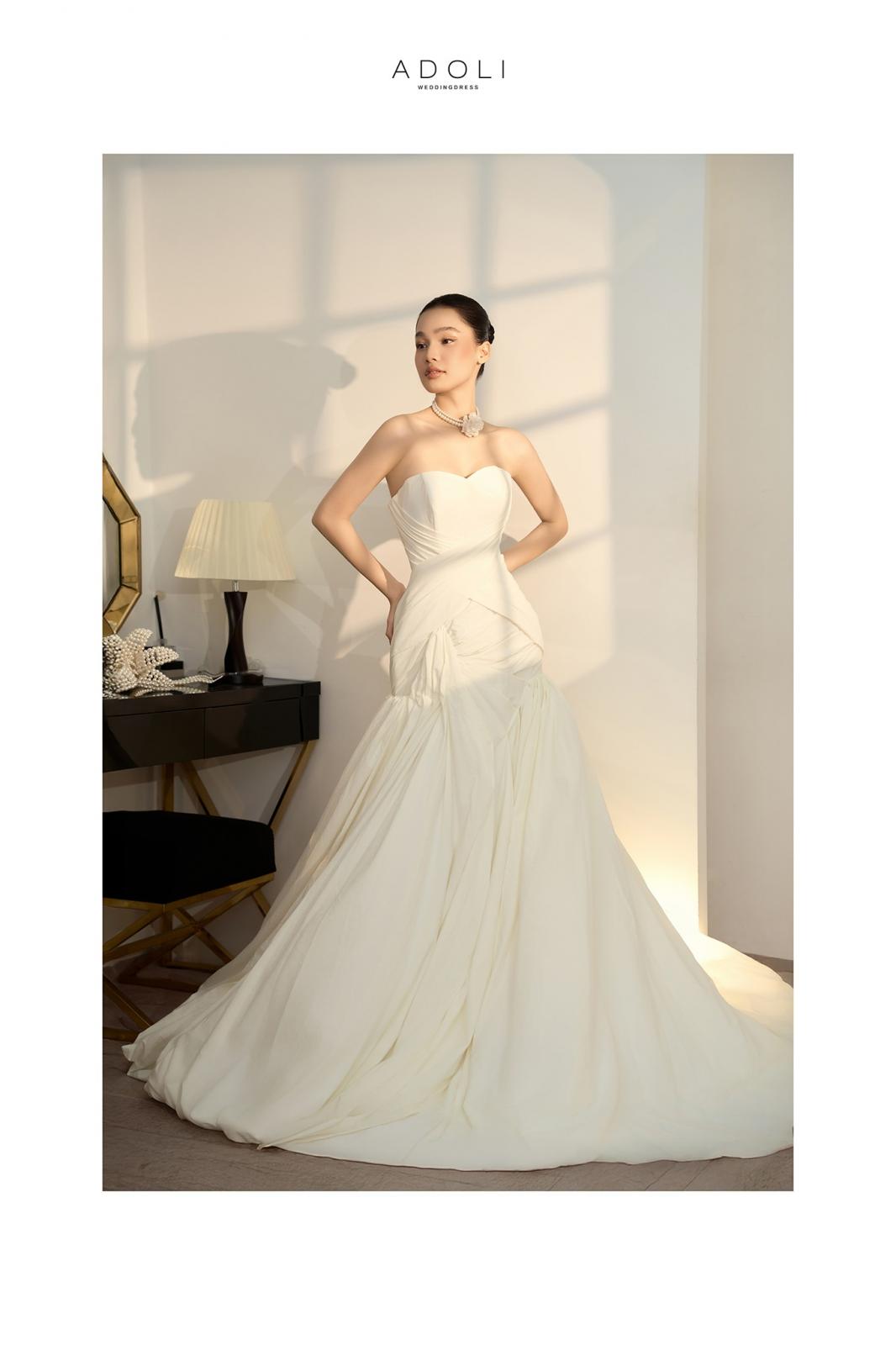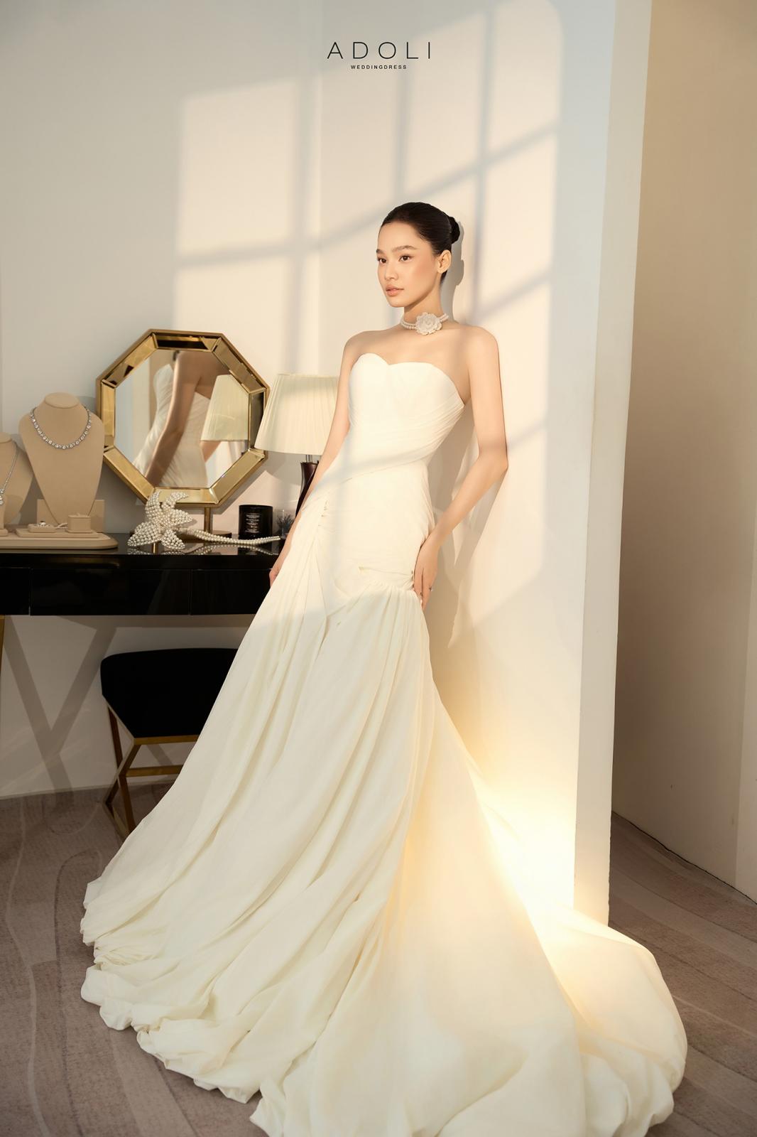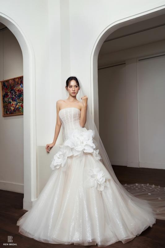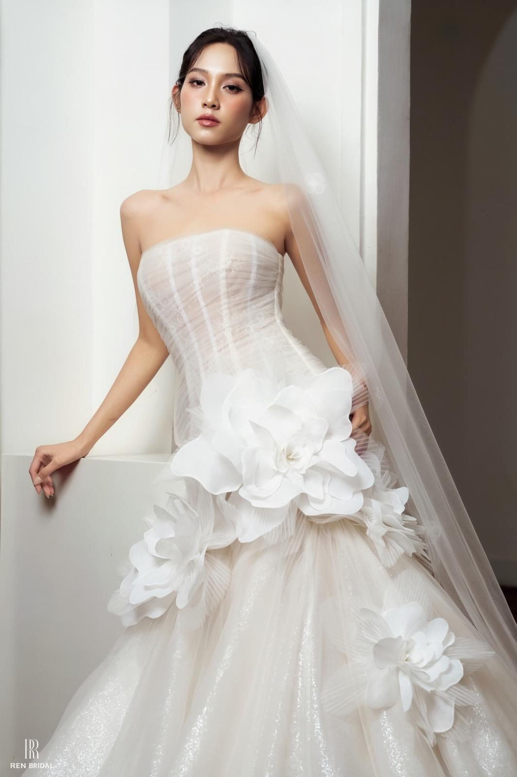 Trên nền vải trắng, hoa 3D được đính kết tỉ mỉ tựa những cánh hoa vừa khẽ nở trong sương, tạo hiệu ứng uyển chuyển và chiều sâu tinh tế. Mỗi đường kim, mũi chỉ đều kể lại câu chuyện về một phong cách thời trang cưới mới – độc bản, cuốn hút và đầy cảm xúc.
