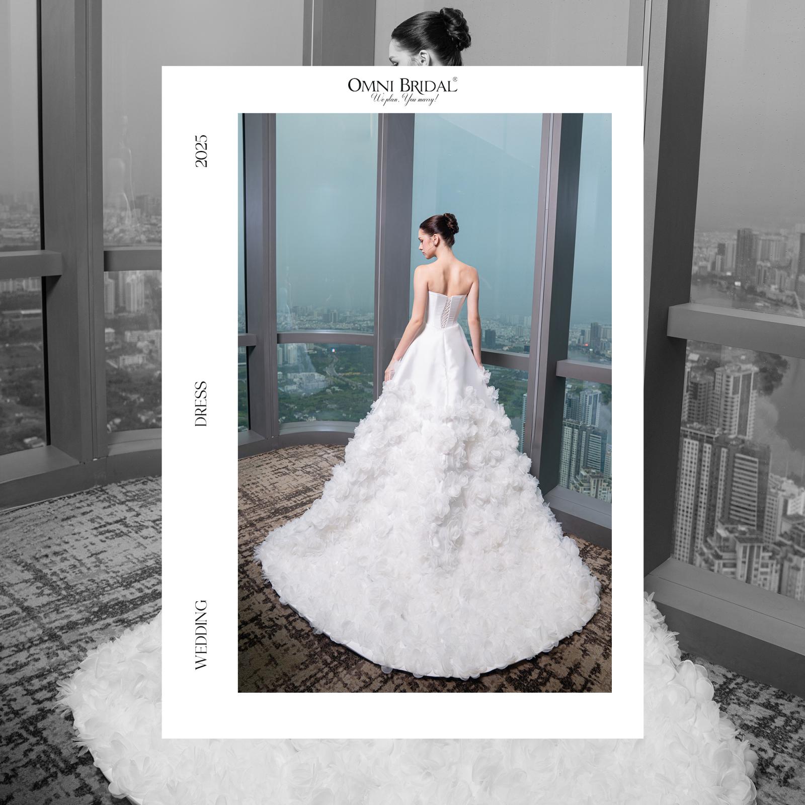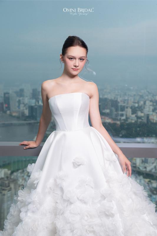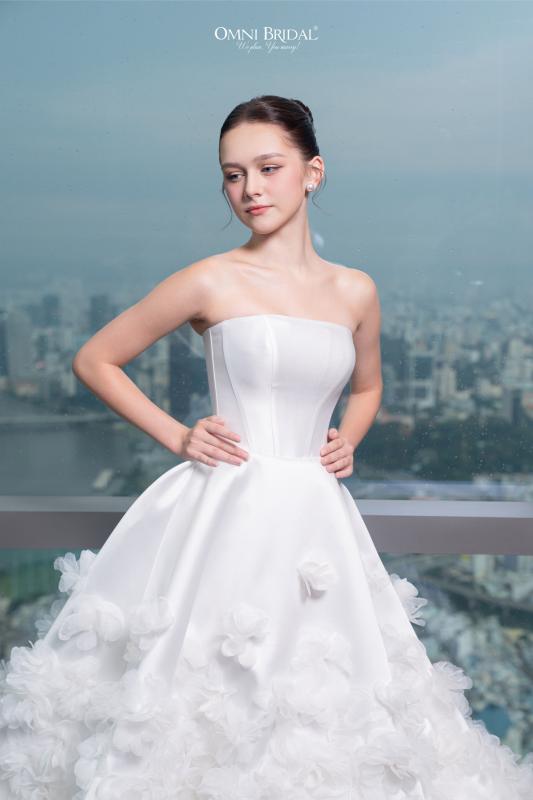 Tựa như “ngôn ngữ của hạnh phúc”, mẫu váy cúp ngực từ chất liệu satin cao cấp, điểm xuyết những đóa hoa 3D tinh xảo, tôn lên nét yêu kiều và dịu dàng theo từng bước chân nàng. Khoảnh khắc nàng khoác lên mình chiếc váy ấy, cũng là khi vẻ đẹp và sự tự tin được thăng hoa trọn vẹn nhất.