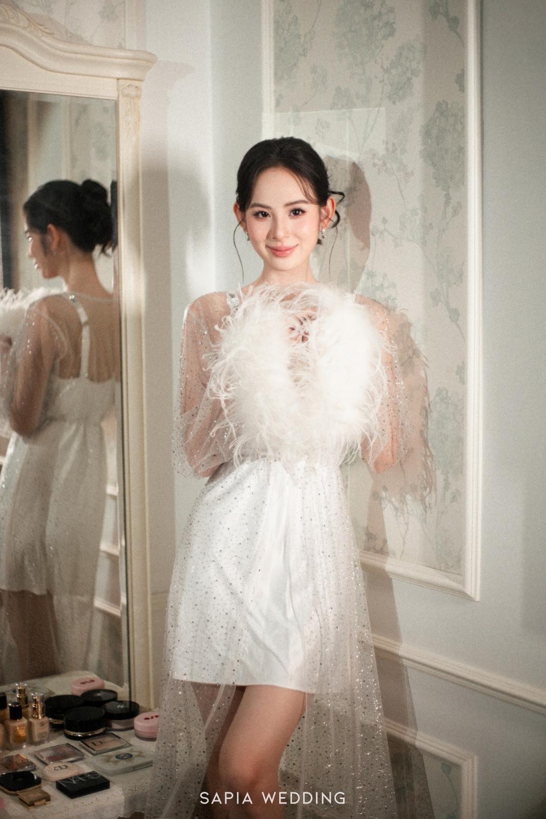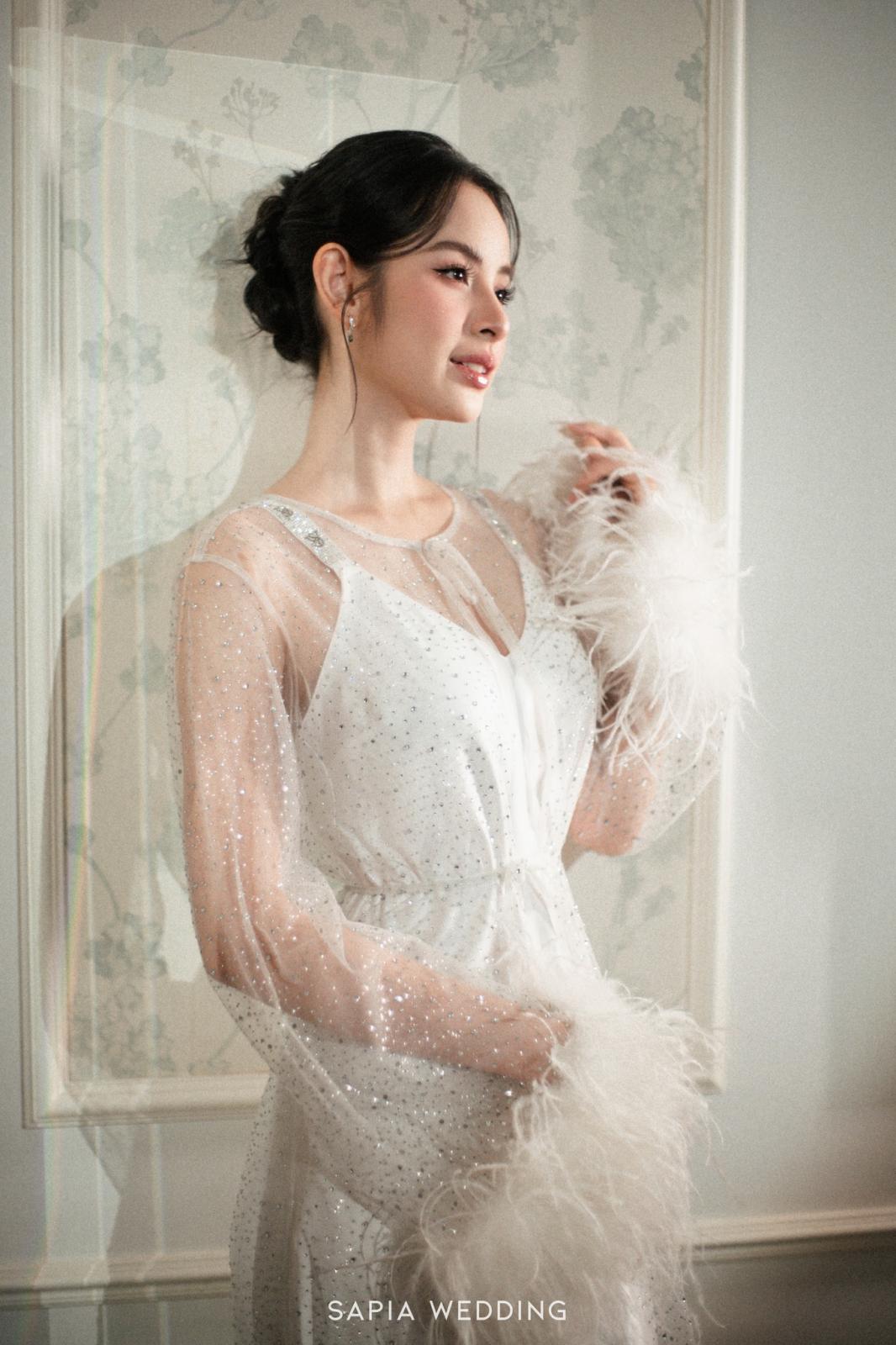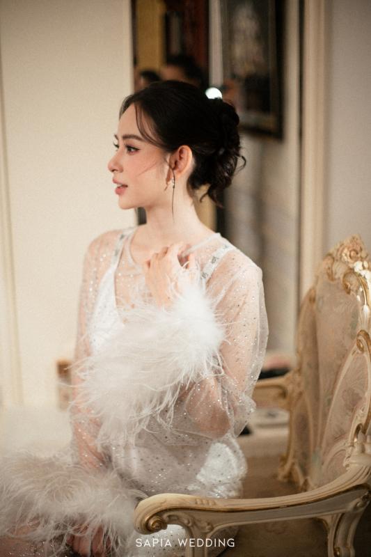Lấy cảm hứng từ sự thanh lịch vượt thời gian và vẻ đẹp thuần khiết, chiếc áp choàng lông vũ nạm đá được thiết kế riêng cho Hương Liên mang sắc trắng tinh khôi đầy tinh tế. Chất liệu Tulle mềm mại kết hợp cùng kỹ thuật đính kết pha lê và những viên ngọc li ti tạo nên hiệu ứng lấp lánh nhẹ nhàng, tựa như sương sớm đậu trên cánh hoa.