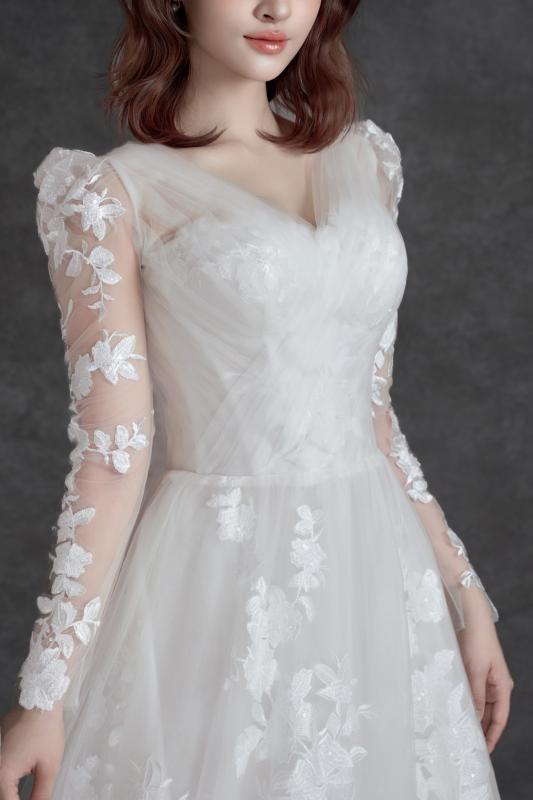 Trên nền vải trắng, hoa 3D được đính kết tỉ mỉ tựa những cánh hoa vừa khẽ nở trong sương, tạo hiệu ứng uyển chuyển và chiều sâu tinh tế. Mỗi đường kim, mũi chỉ đều kể lại câu chuyện về một phong cách thời trang cưới mới – độc bản, cuốn hút và đầy cảm xúc.