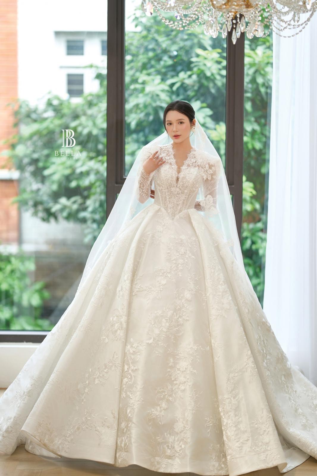 Bên dưới, phần tùng váy phi phủ ren bồng bềnh bằng chất liệu satin cao cấp mang đến độ phồng vừa phải, giữ lại tinh thần tinh khiết.