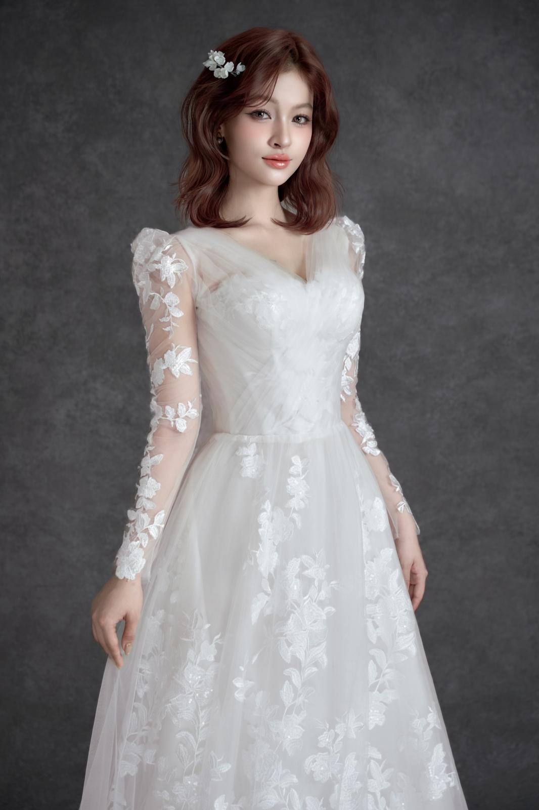 Trên nền vải trắng, hoa 3D được đính kết tỉ mỉ tựa những cánh hoa vừa khẽ nở trong sương, tạo hiệu ứng uyển chuyển và chiều sâu tinh tế. Mỗi đường kim, mũi chỉ đều kể lại câu chuyện về một phong cách thời trang cưới mới – độc bản, cuốn hút và đầy cảm xúc.