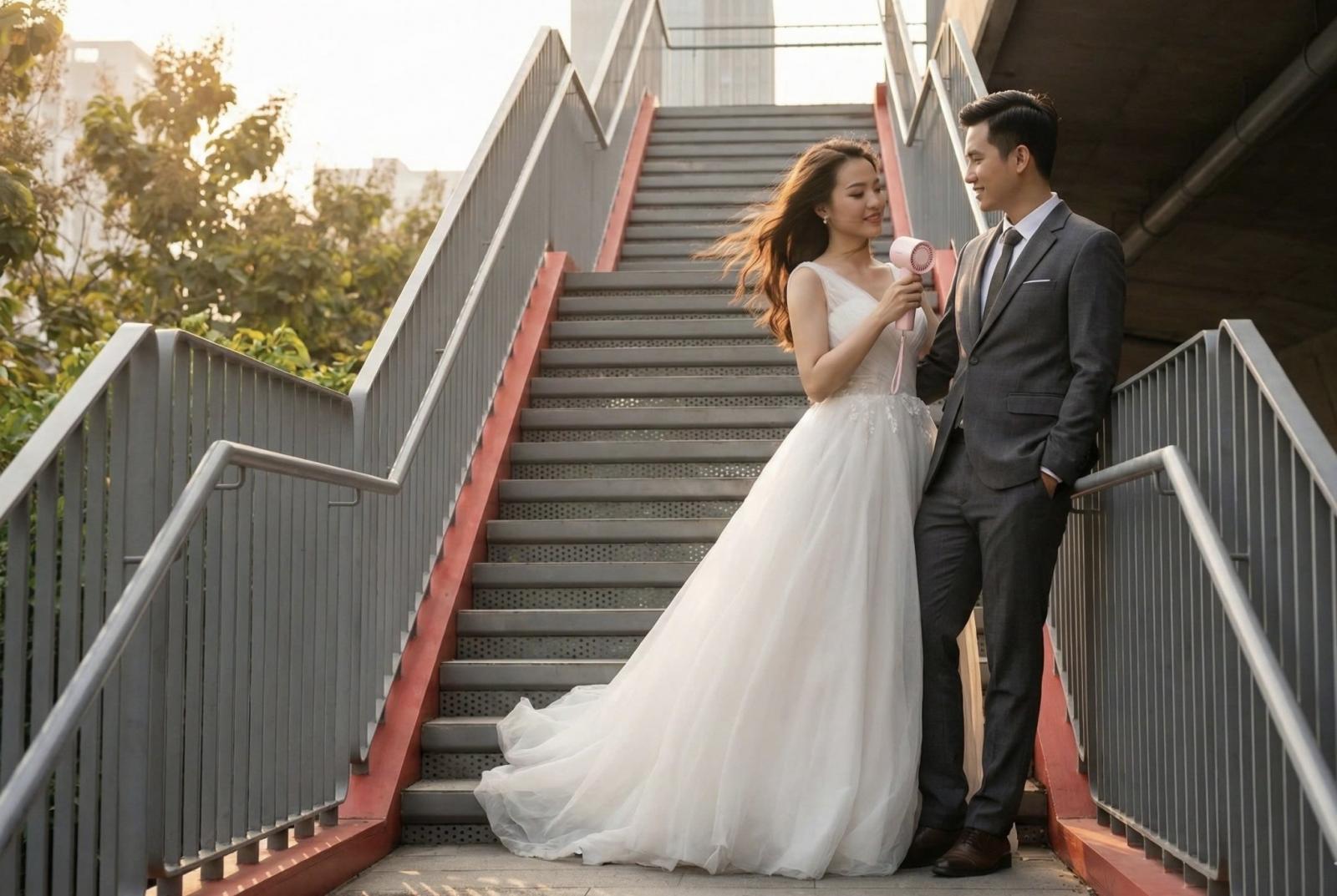 Khi khoác lên mình những chiếc váy cưới lộng lẫy làm từ ren Chantilly nhiều lớp hay lụa Satin dày dặn, nhiệt độ cơ thể của nàng sẽ tăng lên rất nhanh. Đặc biệt là trong những buổi chụp hình ngoại cảnh (pre-wedding) dưới trời nắng gắt hay khi phải di chuyển liên tục để chúc rượu trong tiệc cưới đông người.
