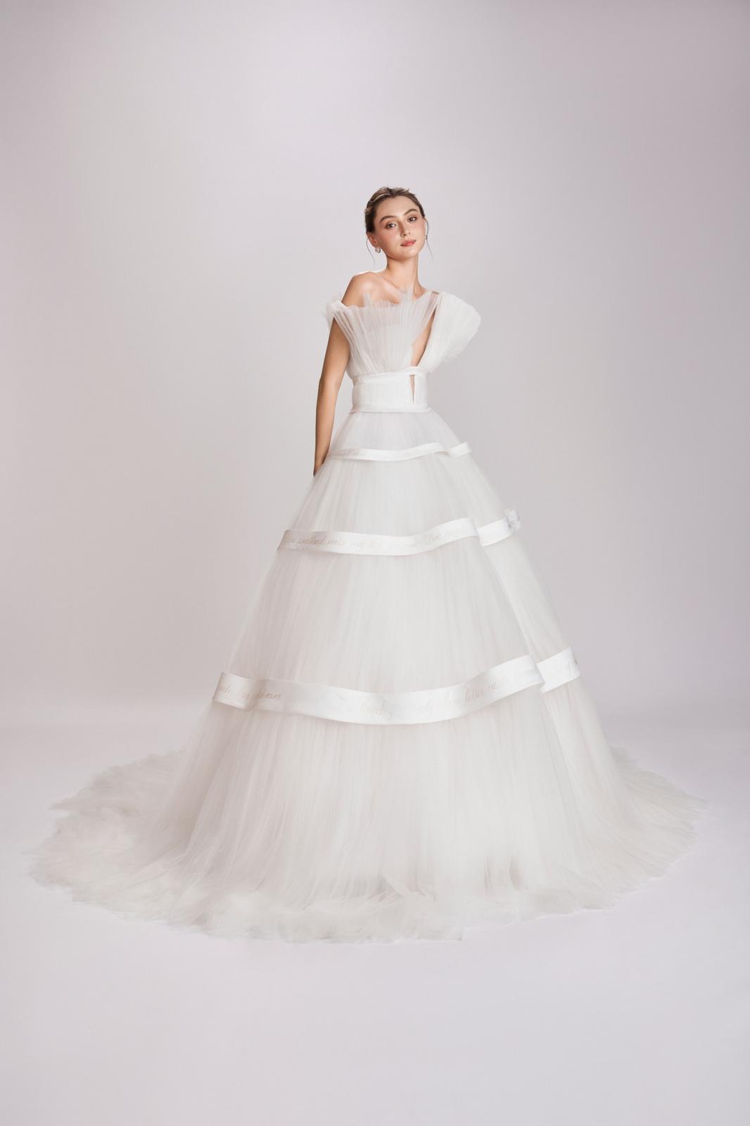 Bên cạnh các chi tiết cầu kỳ, phom dáng tổng thể vẫn giữ được nét kinh điển của dòng váy cưới công chúa. Tùng váy dáng A-line xòe rộng với nhiều lớp tuyn (tulle) chồng lên nhau tạo độ phồng tự nhiên mà không hề gây cảm giác nặng nề.