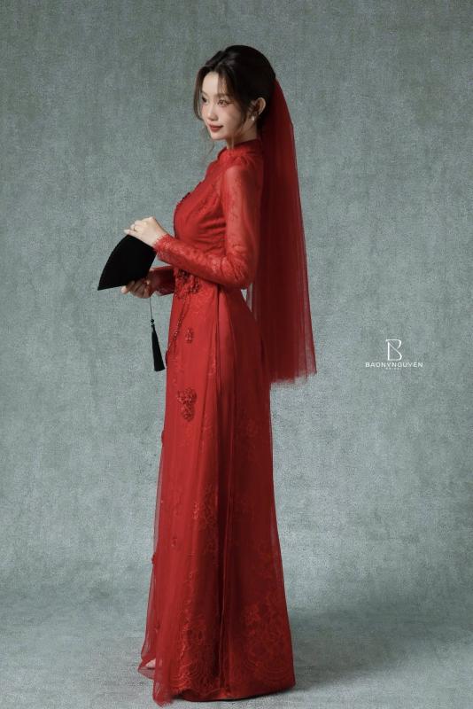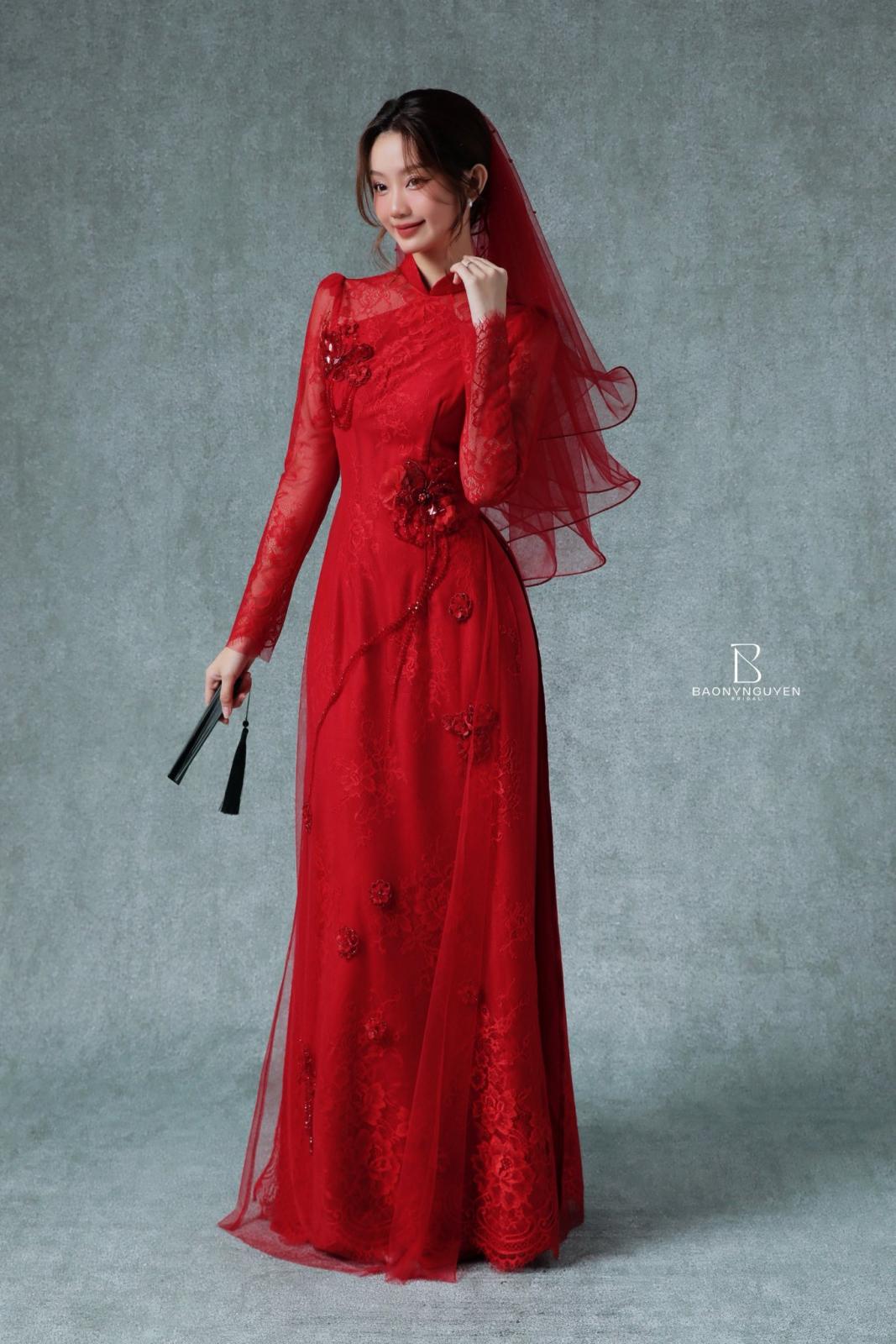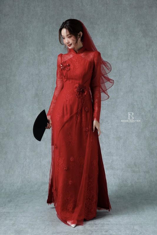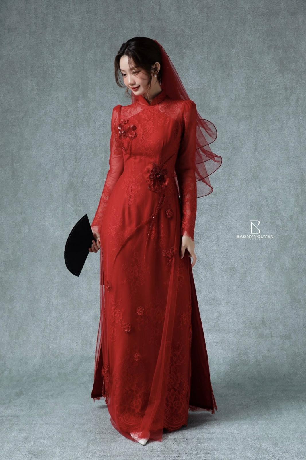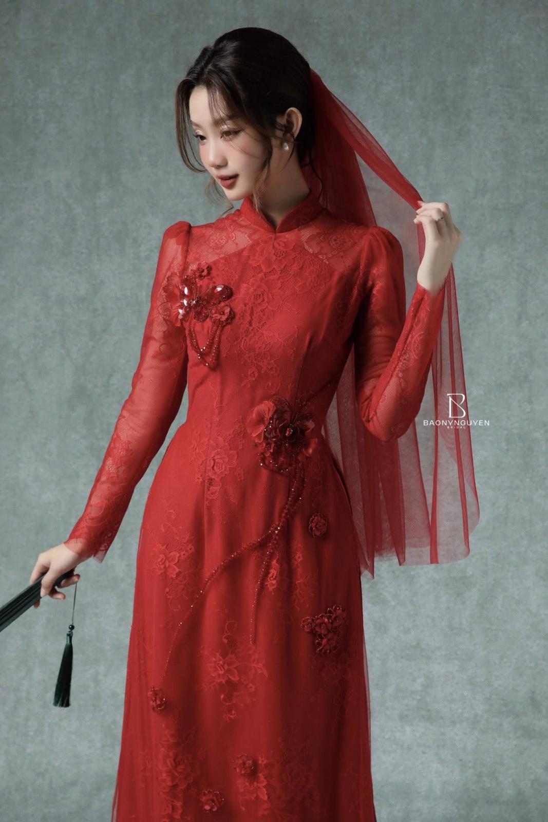 Chiếc áo dài cưới đỏ không chỉ gây ấn tượng bởi sắc màu truyền thống rực rỡ, mà còn chinh phục ánh nhìn nhờ sự đầu tư công phu trong từng chi tiết.