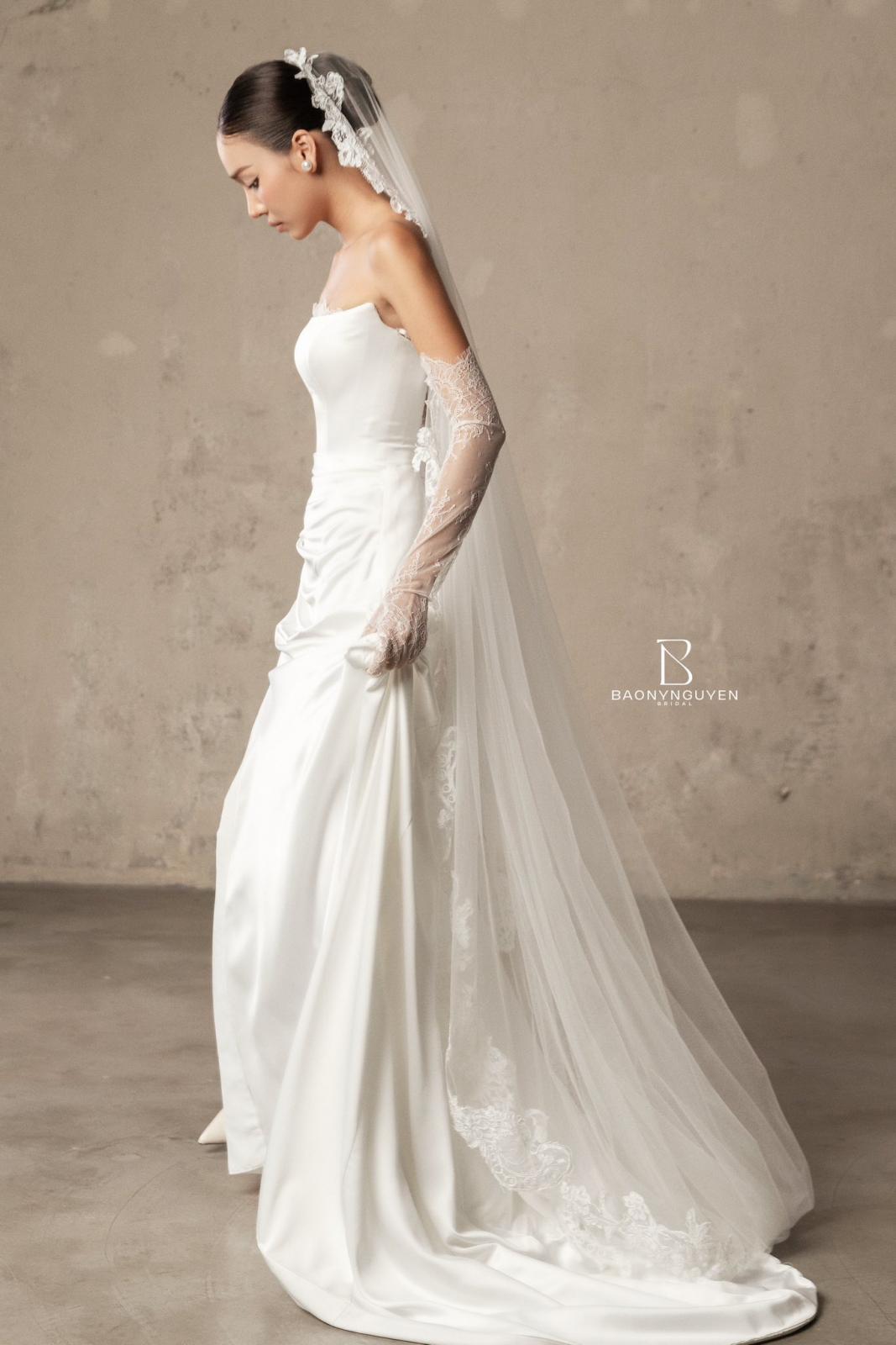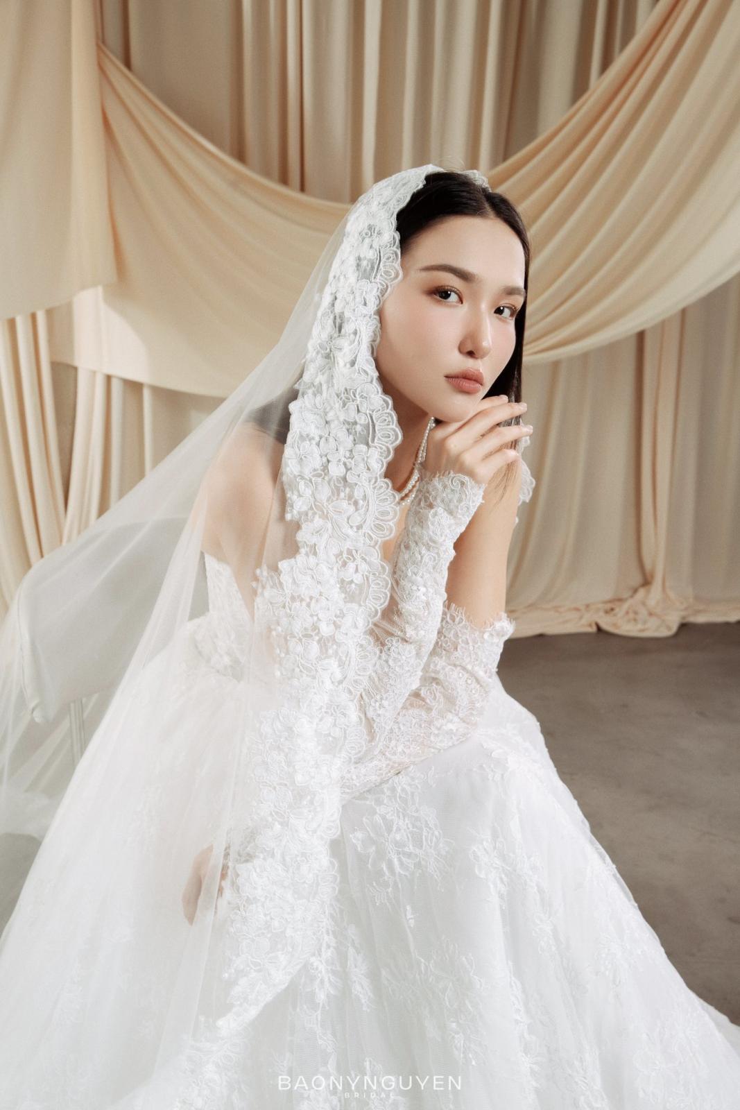 Phom dáng cổ điển được điều chỉnh khéo léo để tôn dáng, cùng với voan cưới cùng tông, mang đến tổng thể thanh thoát nhưng vẫn đầy khí chất.