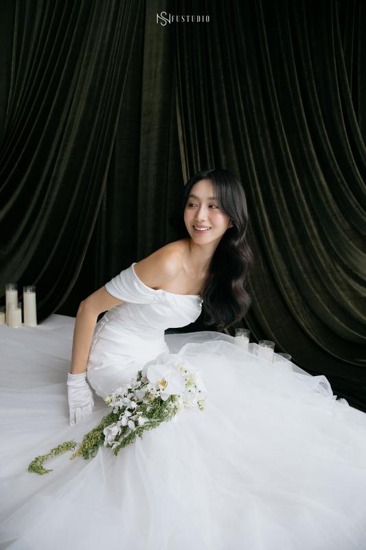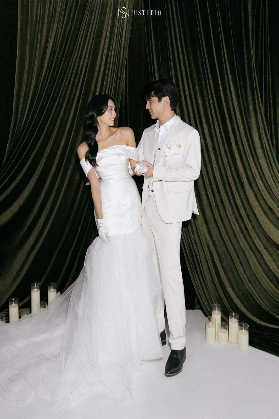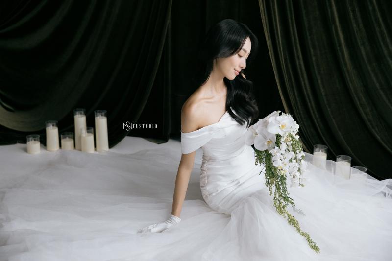 Lấy cảm hứng từ sắc xanh trầm của nhung velvet, concept lần này mang đến một không gian sâu lắng và đầy tính nghệ thuật. Những lớp rèm xanh được wrap theo phong cách Curtain Style tạo nên phông nền mềm mại nhưng vẫn vô cùng high-end, như một sân khấu riêng dành cho vẻ đẹp của cô dâu.