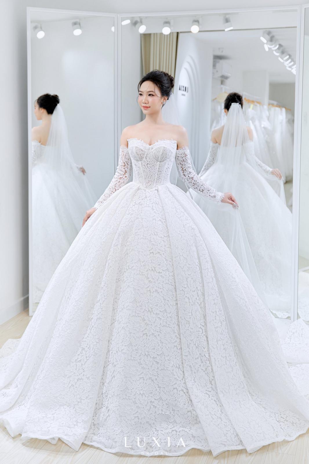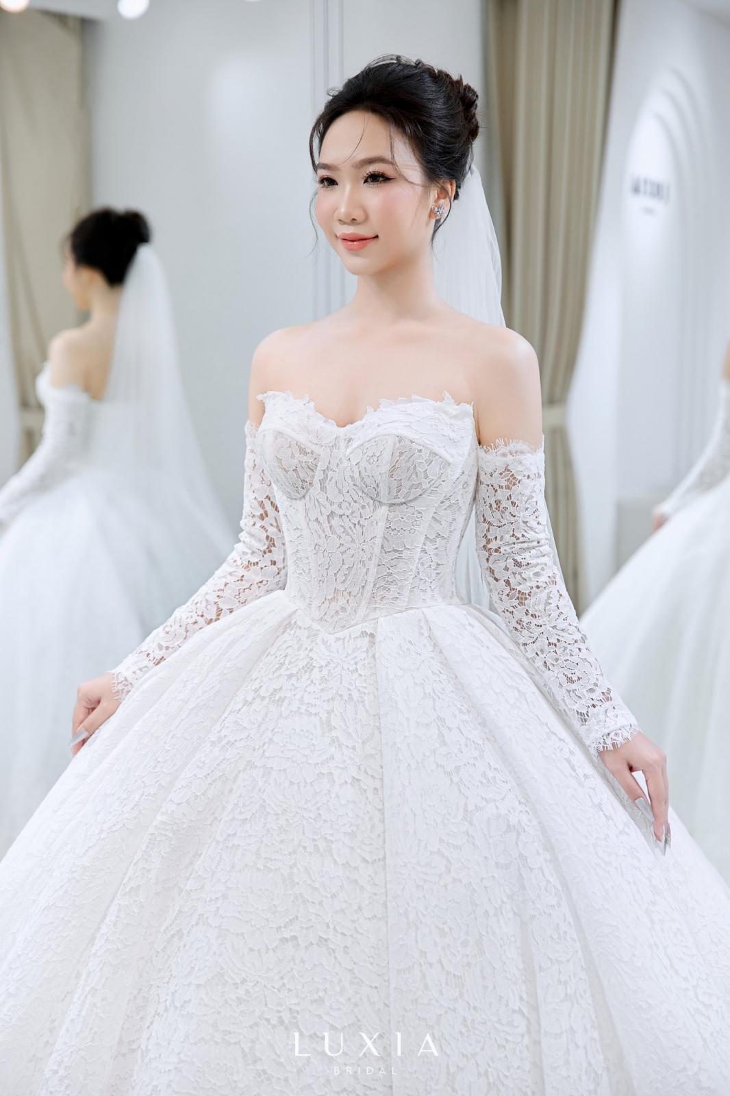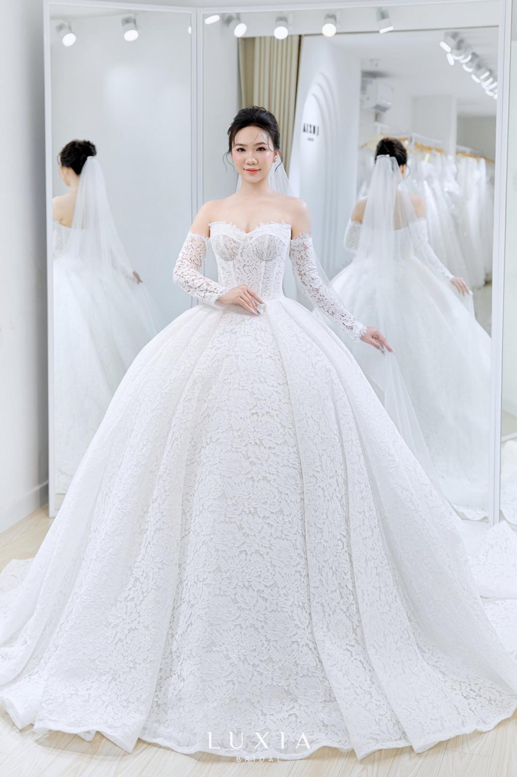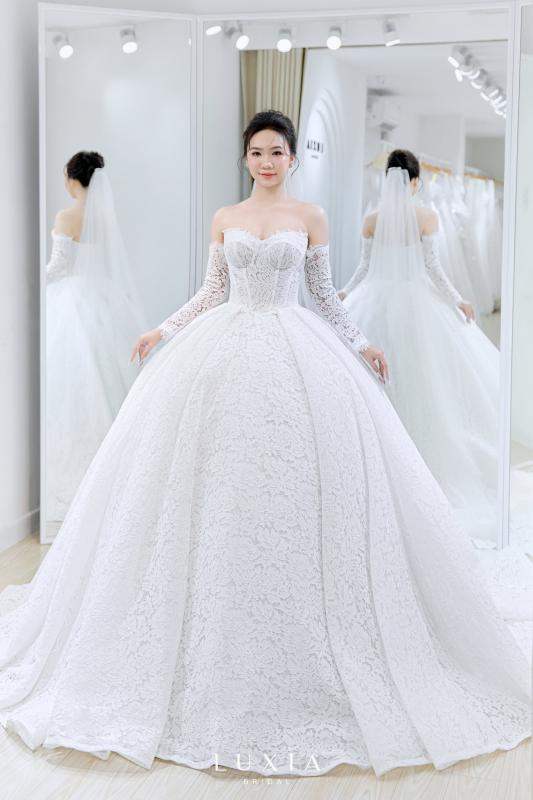 Luxia Bridal rất vinh dự được mang đến chiếc váy cưới với thiết kế lộng lẫy, điểm nhấn ren nổi tinh xảo trải dài trên thân váy, kết hợp cùng phần voan dài bay bổng – biến nàng dâu thành tâm điểm rạng rỡ nhất.