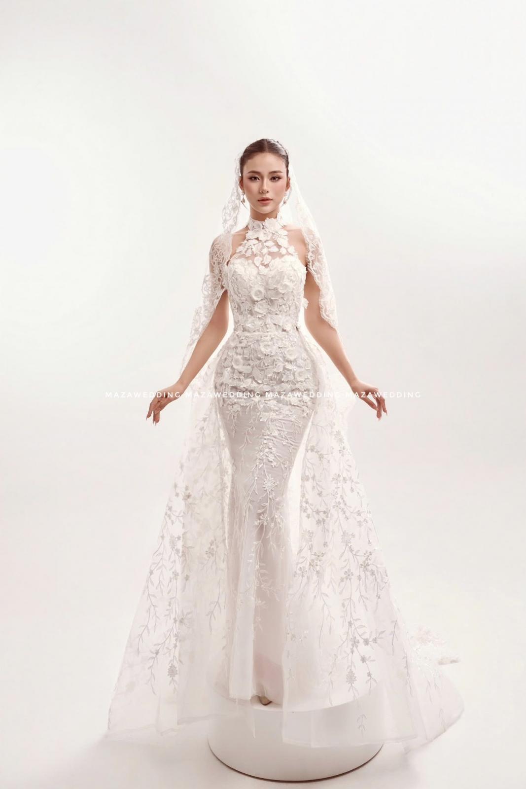 Phom dáng đuôi cá ôm nhẹ, chi tiết ren và đường cắt tinh tế giúp tôn trọn vóc dáng và thần thái cho nàng dâu hiện đại
