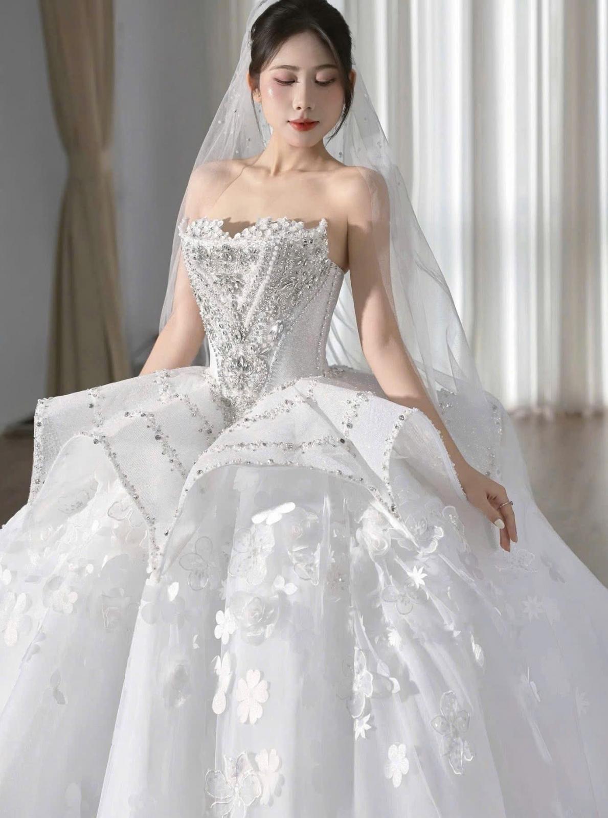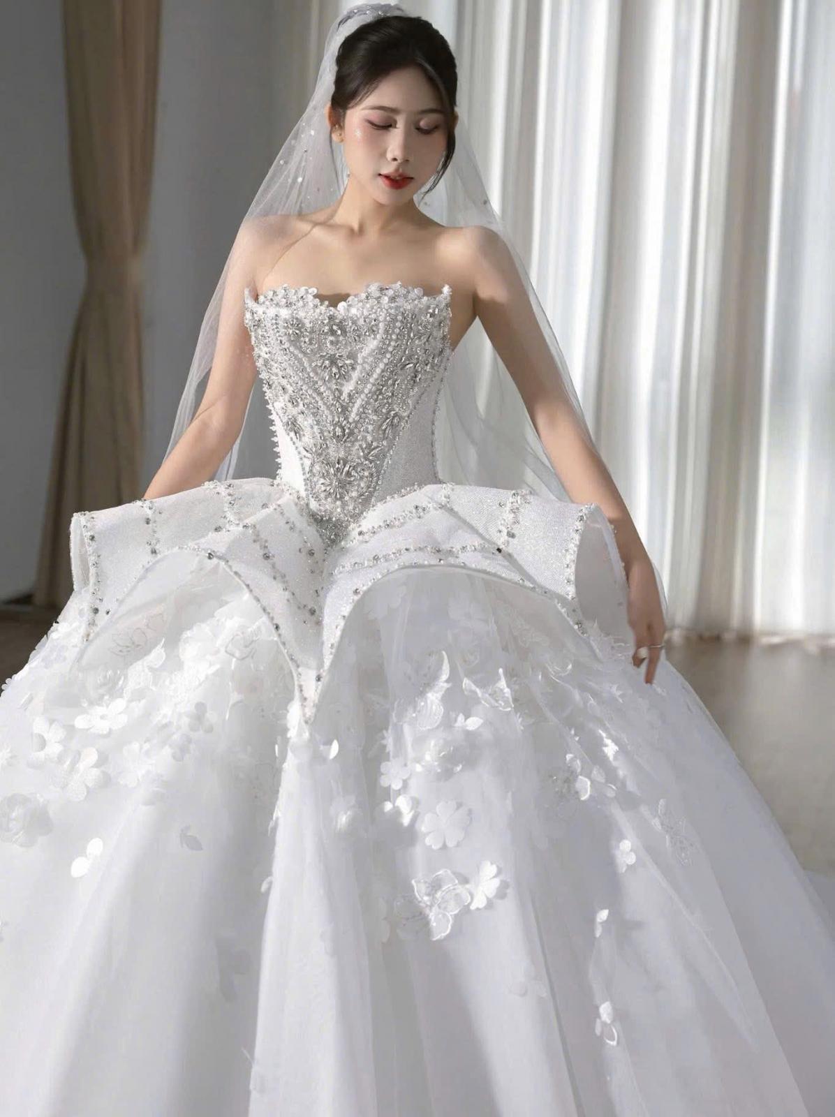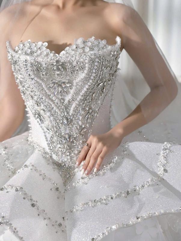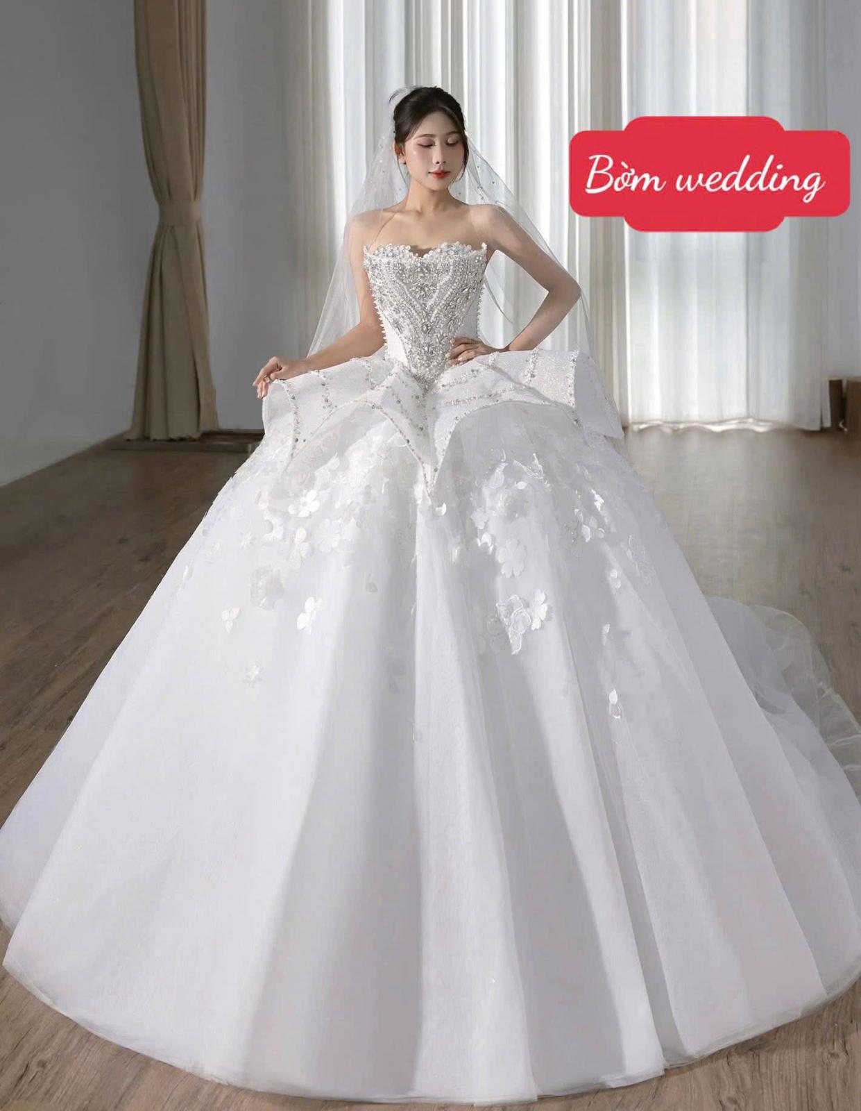 ▪️Mẫu váy cưới lộng lẫy với thiết kế cúp ngực đính đá tinh xảo sang trọng, mang đến cho nàng dâu diện mạo kiêu sa như một nàng công chúa. Form váy xoè bồng bềnh giúp tôn dáng hoàn hảo, che khuyết điểm khéo léo và tạo nên sự lộng lẫy trong từng bước đi. Đây chính là lựa chọn lý tưởng cho cô dâu mong muốn một đám cưới ấn tượng và trọn vẹn giấc mơ cổ tích.