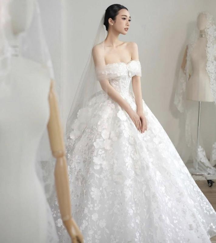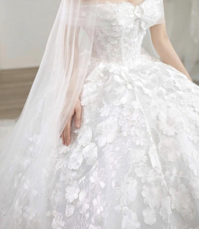 Từng đường ren, mỗi cánh hoa đều được sắp đặt khéo léo – để khi ánh sáng chạm tới, nàng như hóa thân thành biểu tượng của sự thuần khiết và kiêu kỳ.