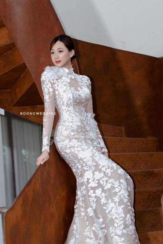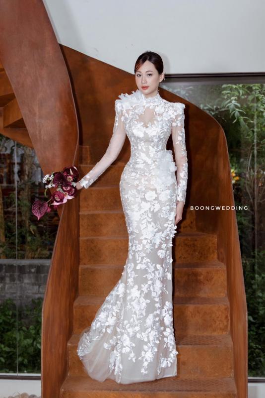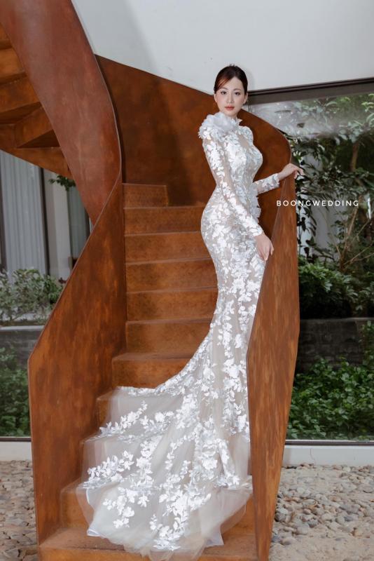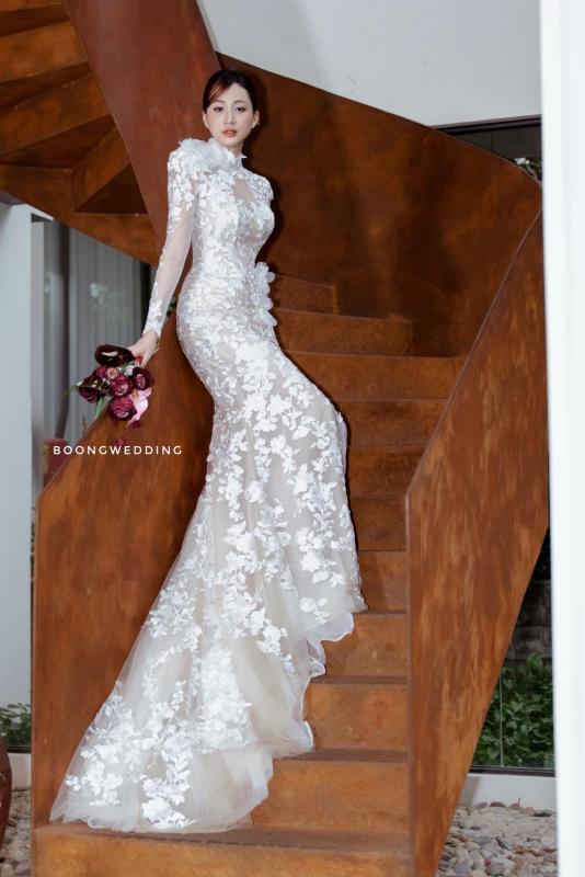 Thiết kế ren hoa 3D cao cấp, form ôm tinh tế, đuôi váy dài uyển chuyển mang đến vẻ đẹp duyên dáng