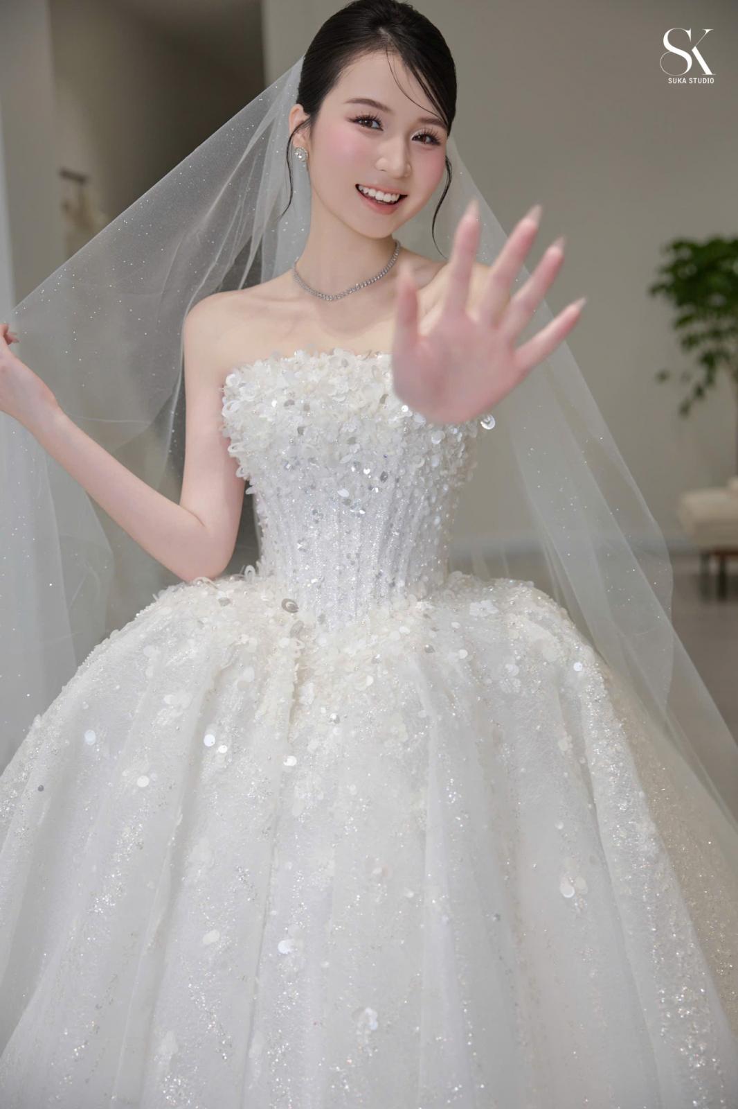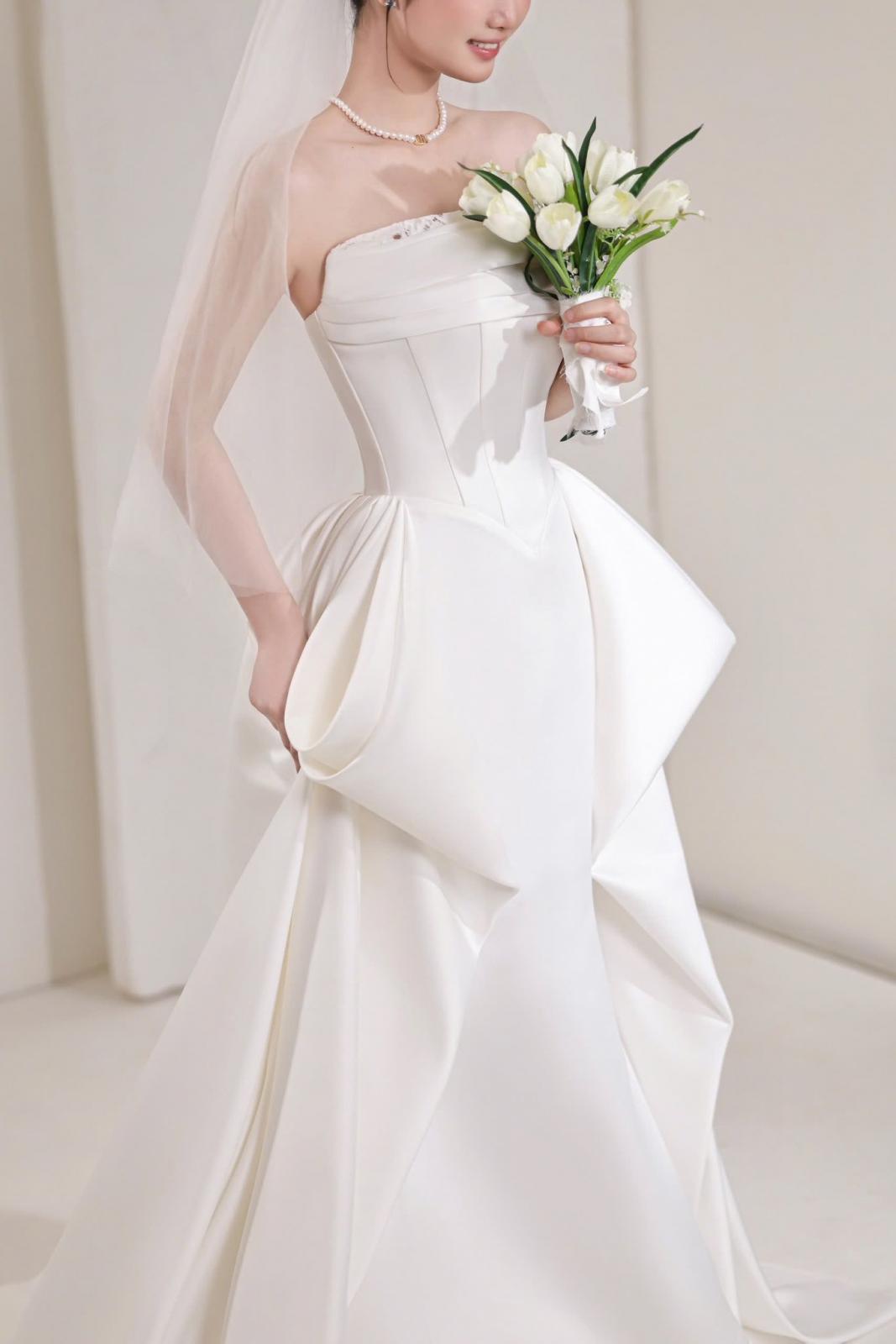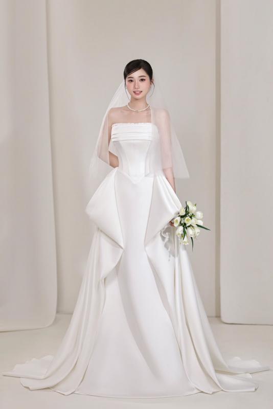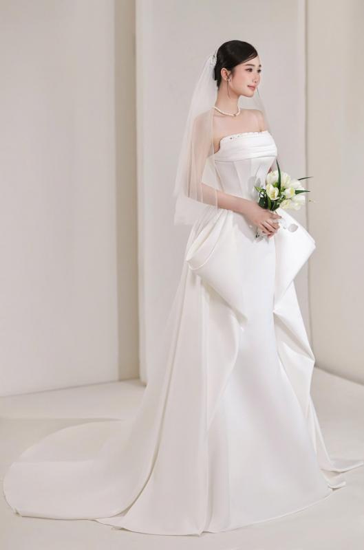 Không cần quá nhiều chi tiết cầu kỳ, chiếc váy vẫn khiến người đối diện phải ngẩn ngơ bởi sự tối giản mà tinh tế – như chính vẻ đẹp tự nhiên và tự tin của nàng trong ngày trọng đại.