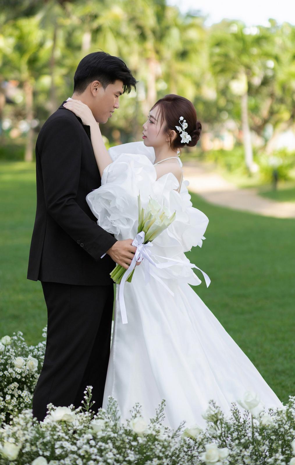 Mỗi bông hoa như một điểm nhấn mềm mại, tạo nên sự nữ tính, bay bổng nhưng không kém phần sang trọng. Đây là lựa chọn hoàn hảo cho nàng dâu yêu thích sự lãng mạn, mong muốn tỏa sáng trong từng khoảnh khắc.